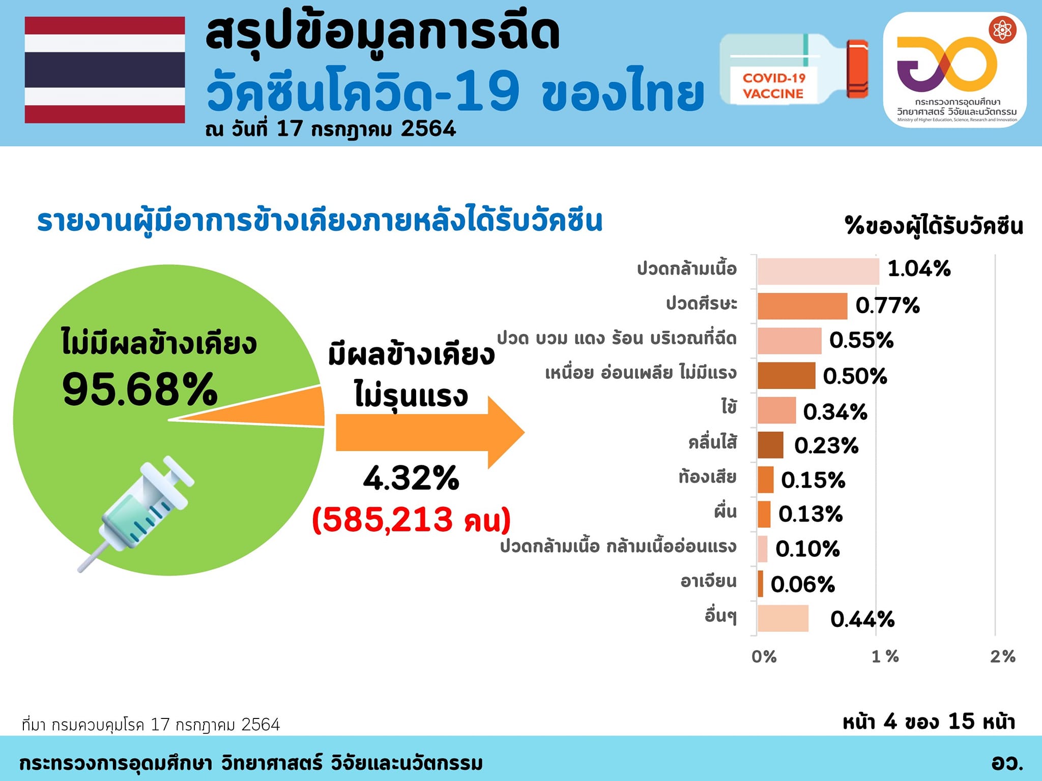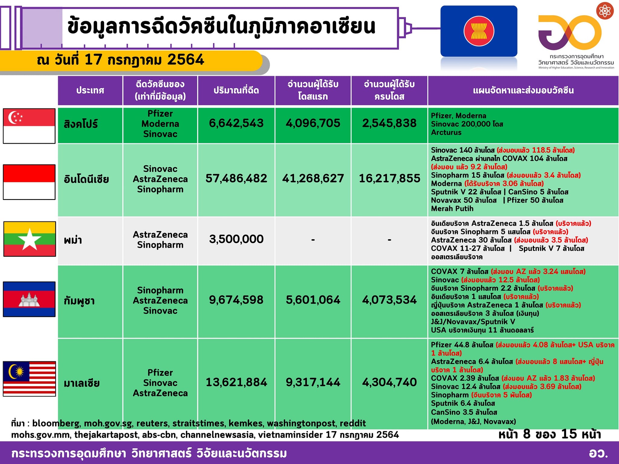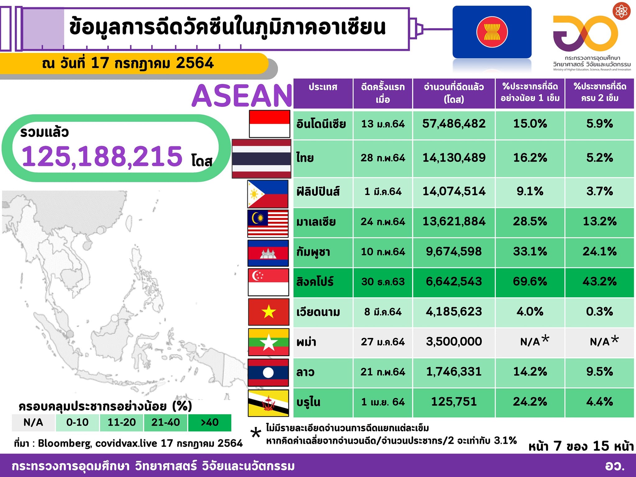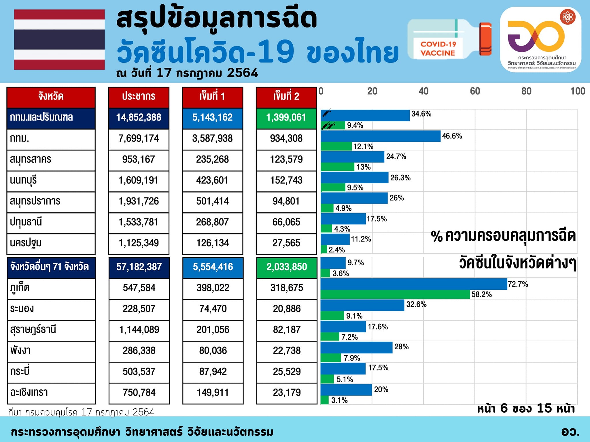 (17 กรกฏาคม 2564) ศาสตราจารย์ ดร. นายแพทย์สิริฤกษ์ ทรงศิวิไล ปลัดกระทรวงการอุดมศึกษา วิทยาศาสตร์ วิจัยและนวัตกรรม (อว.) รายงานว่า ในขณะนี้ประเทศไทยได้ฉีดวัคซีนโควิด-19 แล้ว จำนวนรวม 14,130,489 โดส ซึ่งเป็นลำดับที่สองในภูมิภาคอาเซียนในแง่จำนวนการฉีด โดยมีผู้ที่ได้รับวัคซีนแล้วอย่างน้อยหนึ่งเข็ม จำนวน 10,697,578 คน หรือเท่ากับ 16.2% ของประชากร คิดเป็นอันดับ 5 ของอาเซียนในแง่สัดส่วนประชากรที่ได้รับวัคซีน และได้ฉีดครบสองเข็มแล้ว 3,432,911 คน หรือเท่ากับ 5.2% ของประชากร