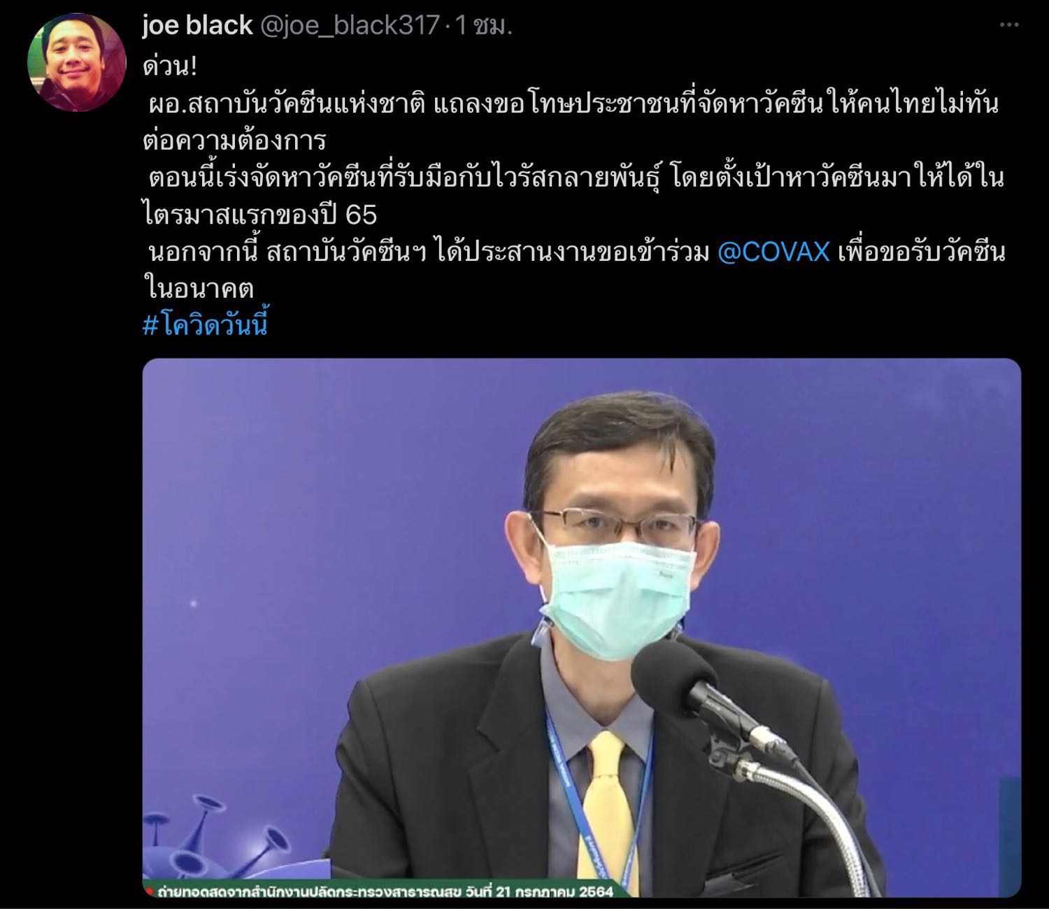 “ท่านพูดแต่ว่า ทุกวันนี้มีคนตายเป็นจำนวนมาก เพราะโควิด เนื่องจากวัคซีนไม่ดีเป็นความผิดของรัฐบาล แล้วมันจริงหรือไม่ ขอให้อย่ามองเพียงด้านเดียว ต้องนึกถึงสิ่งที่รัฐบาลได้ทำมาได้จัดหาวัคซีนมาอย่างดีตามมาตรฐาน เทียบกับประเทศเพื่อนบ้านในตอนนี้ ปัจจุบันหากมองภาพรวมในภูมิภาคอาเซียน ประเทศไทย ได้รับการฉีดวัคซีนเป็นอันดับ 2 ซึ่งช่วงวิกฤติที่ผ่านมา ทุกภาคส่วนได้ช่วยเหลือกันอย่างเต็มที่เพื่อให้สถานการณ์การระบาดโควิดคลี่คลายให้เร็วที่สุด จึงจำเป็นจะต้องได้รับความร่วมมือและให้กำลังใจซึ่งกันและกัน ร่วมแรงร่วมใจกันต่อสู้กับภัยโควิด บนพื้นฐานความปลอดภัยและความรับผิดชอบต่อสังคมในสถานการณ์นี้”