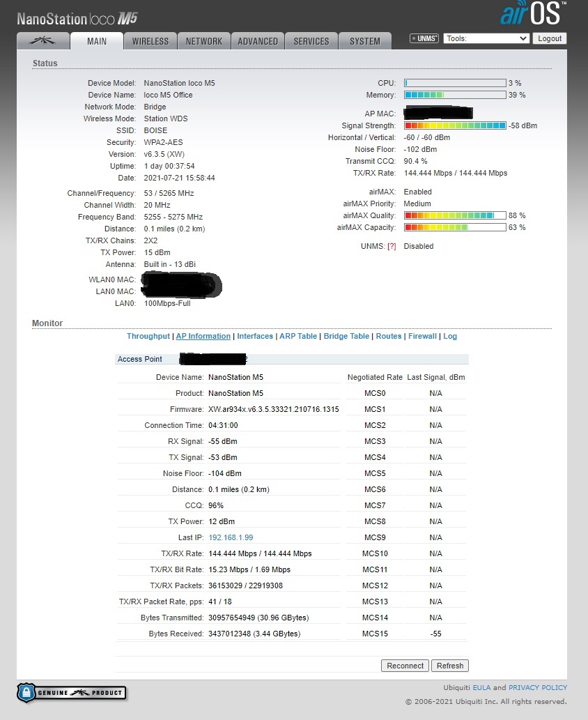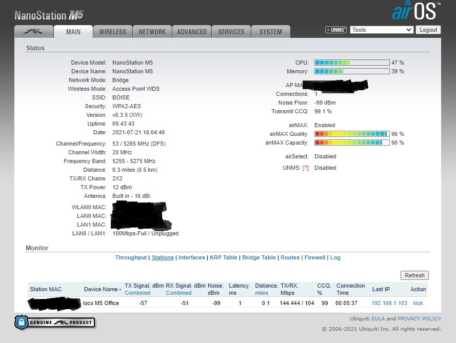 รบกวนสอบถามปัญหาการเชื่อมต่อ UBIQUITI NSM5/LOCOm5ครับ
