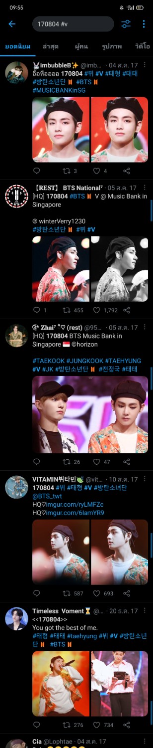 หลังจากนั้นเรามา search หาในทวิตเตอร์ค่ะ เพราะส่วนมากบ้านแฟนไซต์จะอยู่ในทวิต เราsearch แบบนี้ค่ะ : 170804 #v อันนี้เราหาเฉพาะของวีคนเดียว ถ้าจะหารูปคนอื่นก็เปลี่ยนชื่อตามนั้นเลย