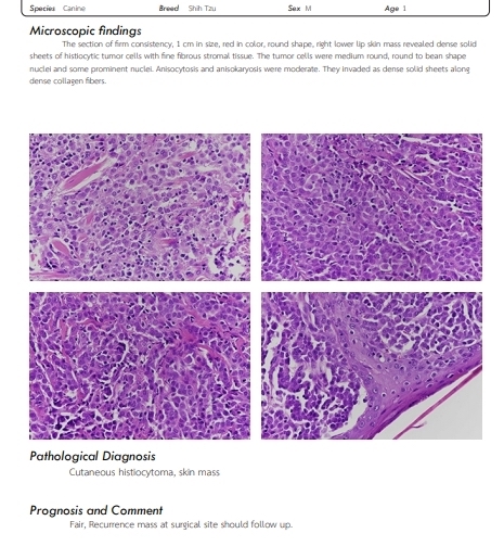 ลูกชายพันธุ์ชิสุห์ อายุ 1 ปี 6 เดือน มีก้อนเนื้อขึ้นที่ริมฝีปากล่าง ไปตรวจแล้วหมอแนะนำให้ผ่า ส่งชิ้นเนื้อไปตรวจคุณหมอโทรมาแจ้งว่าน้องเป็นมะเร็ง และส่งผลชิ้นเนื้อที่ไปตรวจกลับมาดังนี้ค่ะ