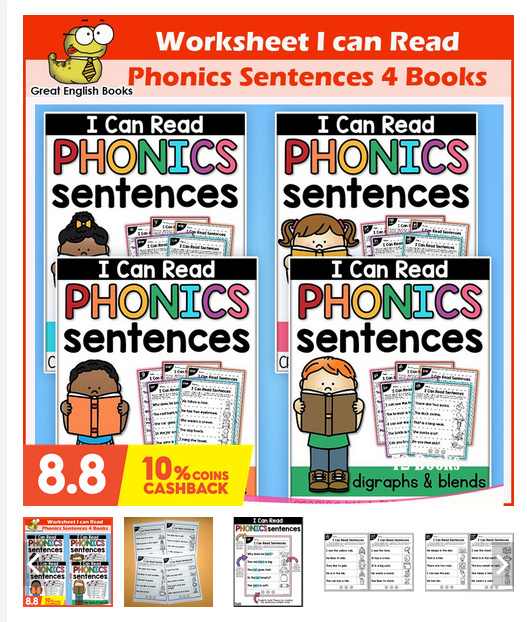 14. Worksheet สำหรับเด็กๆฝึกหัดอ่านโฟนิกส์ I can Read Phonics Sentence ชุด 4 เล่ม ขนาด A4 122 หน้า 150.-