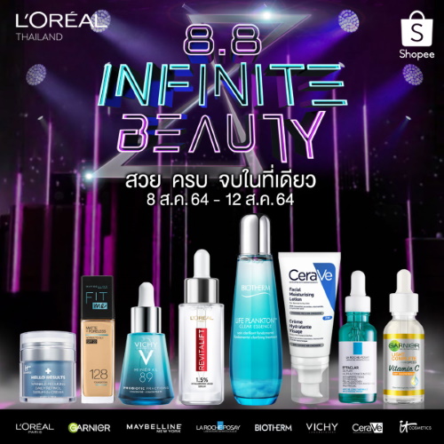 ‘Infinite Beauty’ วัน 8.8 ครั้งแรกที่รวม 8 บิวตี้แบรนด์ดัง ส่งโปรโมชั่นจัดเต็ม 5 วันติด ระหว่างวันที่ 8-12 สิงหาคมนี้ เพื่อความงามที่ไร้ขีดจำกัด 8 บิวตี้แบรนด์ดังที่จะมอบความฟินในการช้อปปิ้งแบบ New Normal ผ่าน Shopee Mall ในแคมเปญ Infinite Beauty ได้แก่แบรนด์ ลอรีอัล ปารีส, การ์นิเย่, เมย์เบลลีน นิวยอร์ก, ลา โรช-โพเซย์, วิชี่, เซราวี, ไบโอเธิร์ม, และ อิท คอสเมติกส์ โดยเตรียมส่งโปรโมชั่นส่วนลดสูงสุดถึง 50% และของขวัญกิ๊ฟท์เซ็ตสุดเอ็กซ์คลูซีฟมากมาย พร้อมดีลสุดพิเศษสำหรับ 8 ชั่วโมงแรก ตั้งแต่ 0.00 น. - 08.00 น. ของวันที่ 8 สิงหาคม 2564