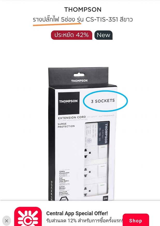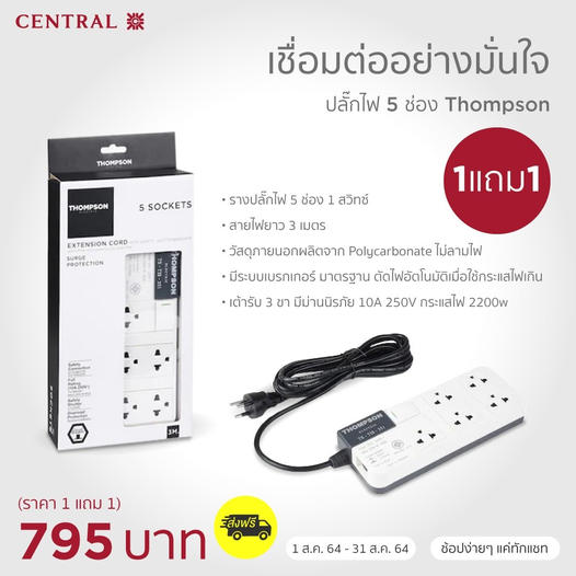 ปลั๊กไฟ 5 ช่อง 1SW Thompson สะดวก พกพาง่าย น้ำ🗲ทนทาน พร้อมใช้งาน
