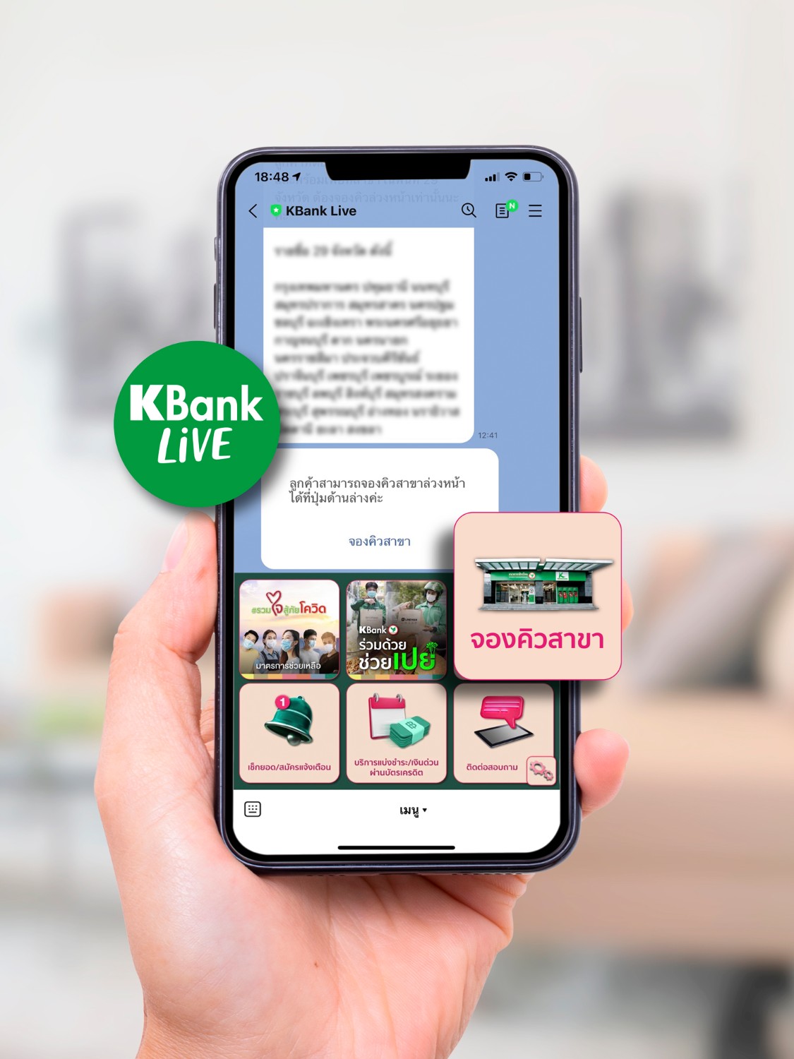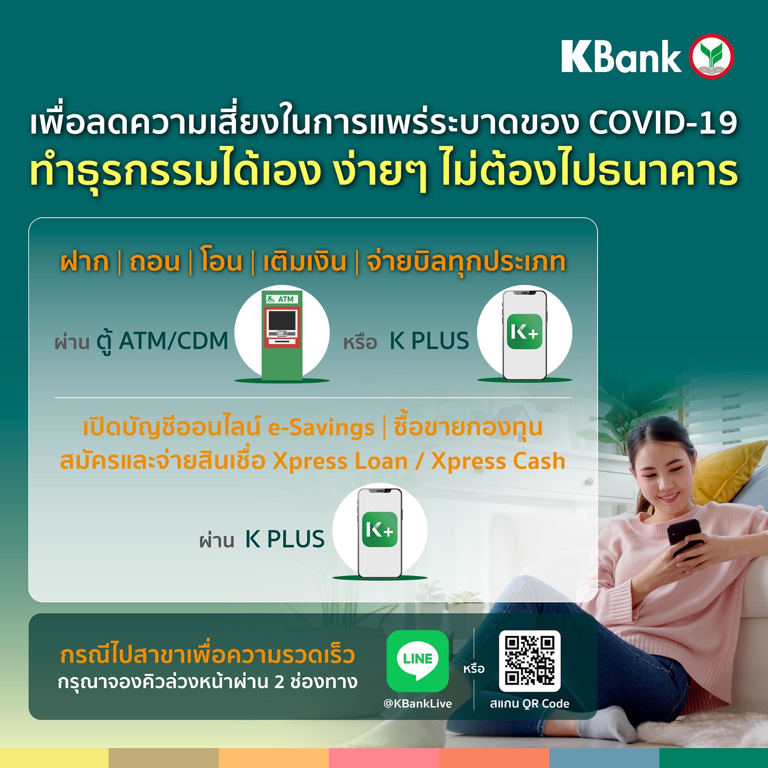 ธนาคารกสิกรไทย ขอแนะนำให้ลูกค้าที่จำเป็นต้องใช้บริการที่สาขา เช่น ต้องการเปิดบัญชีต่างๆ สามารถจองคิวล่วงหน้าผ่าน 2 ช่องทาง โดยเข้าไปที่แอปพลิเคชัน LINE แล้วกด @KBank Live เลือก “จองคิวสาขา” จากนั้นกดเลือกสาขา วันที่ และเวลาที่ต้องการ โดยธนาคารขอจำกัดช่องให้บริการและจำนวนลูกค้าที่สาขา โดยลูกค้า 1 ท่าน สามารถทำได้ 3 ธุรกรรม และงดแลกเหรียญหรือธนบัตร เพื่อเว้นระยะห่างทางสังคม ลดความแออัด และเลี่ยงการหยิบจับเงินสด