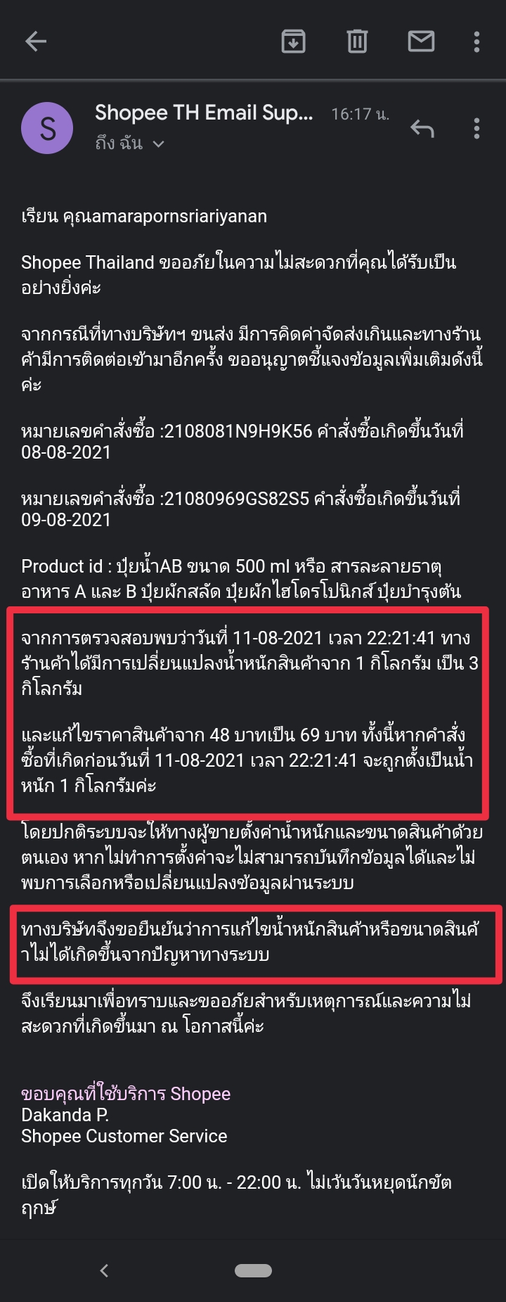 เราสร้างสินค้าขึ้นเมื่อวันที่ 03-08-2021 ใส่น้ำหนักครั้งแรกไว้เป็น 1 กิโลกรัม แต่เมื่อลองนำสินค้าใส่กล่องและชั่งกิโลกรัมพบว่าน้ำหนักที่ได้เกิน 1 กิโลกรัมจึงปรับแก้น้ำหนักเป็น 2 กิโลกรัม และใช้น้ำหนักนี้เป็นต้นมา วันที่shopeeจัดโปรฯ8.8 orderแรกของสินค้านี้ที่เข้ามาที่เข้ามาไม่มีปัญหาเรื่องน้ำหนัก จนมีออเดอร์ที่ 3 เข้ามา และพบว่ามีการจ่ายเงินให้ร้านค้าน้อยผิดปกติ จึงเข้าไปตรวจสอบสินค้า กลับพบว่ามีการปรับแก้น้ำหนักเองเป็น 1 กิโลกรัม(ซึ่งการปรับแก้สินค้าเป็น 1 กิโลกรัมเราคงจะไม่ทำเพราะรู้ว่าสินค้าชุดหนึ่ง น้ำหนักเกิน 1 กิโลกรัมแล้ว) น่าจะเป็นความผิดพลาดของระบบจากshopee