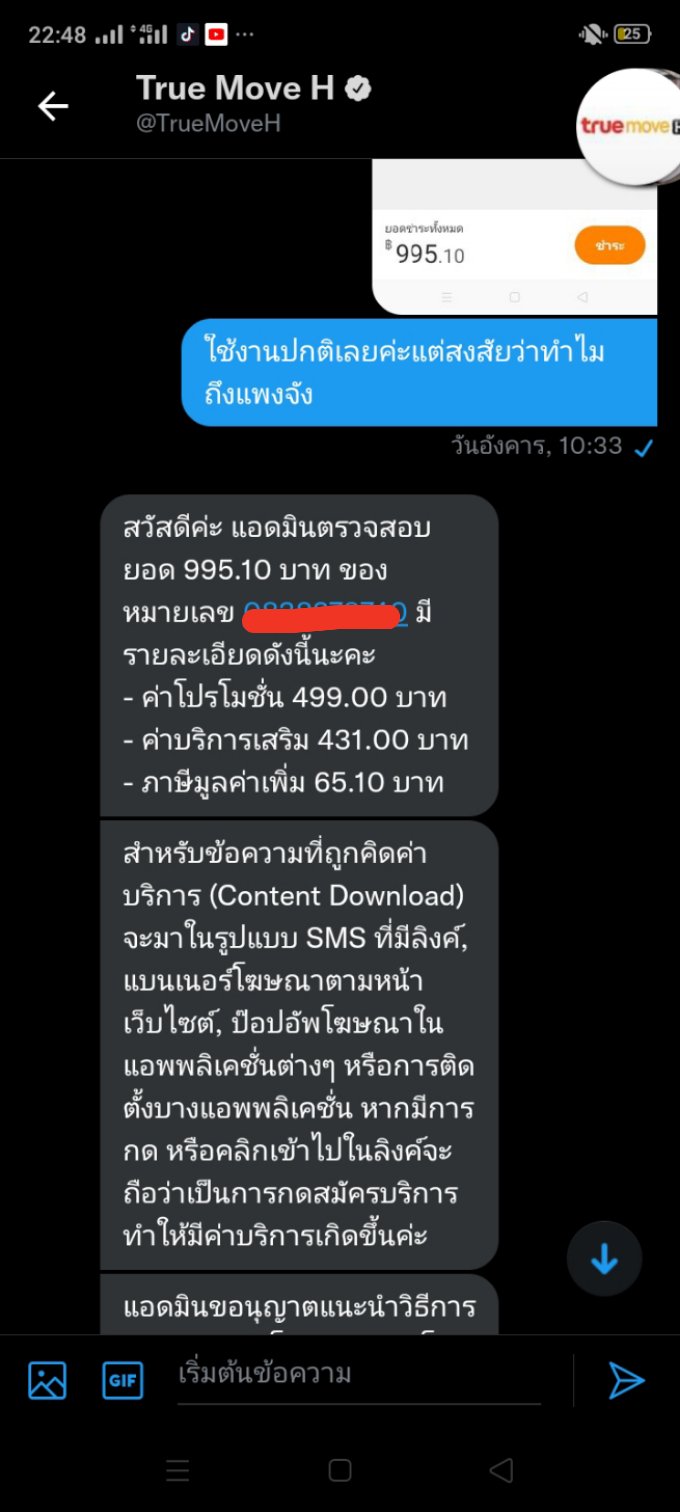 คือส่วนตัวใช้โปร499/1 เดือน แล้วที่นี้ค่าเน็ตของเดือนนี้มาที่995 บาท ทั้งที่ใช้งานปกติเลย คือติดต่อทรูผ่านทวิตเตอร์ไปตั้งแต่วันอังคารก็คือไม่ได้เรื่องอะไรเลยจนเน็ตจะตัดอยู่แล้ว บอกว่าเราเสียค่าบริการส่วนต่างนอกเหนือจากค่าโปร แล้วคือค่าบริการส่วนต่างที่ต่างเยอะพอกับค่าโปรเลยว่างั้น บอกว่าเสียค่าข้อความคิดเงินนู่นนี่ทั้งที่ก็ไม่ได้สมัครอะไรเลย ใช้งานปกติ ถ้าเป็นแบบนี้ก็จ่ายไม่ไหวเหมือนกันนะคะ ⚠️รวบกวนหน่วยงานที่เกี่ยวข้องตอบคำถามหน่อยค่ะว่าทำไมเราถึงต้องจ่ายแพงขนาดนี้ทั้งที่มันไม่สมควร⚠️