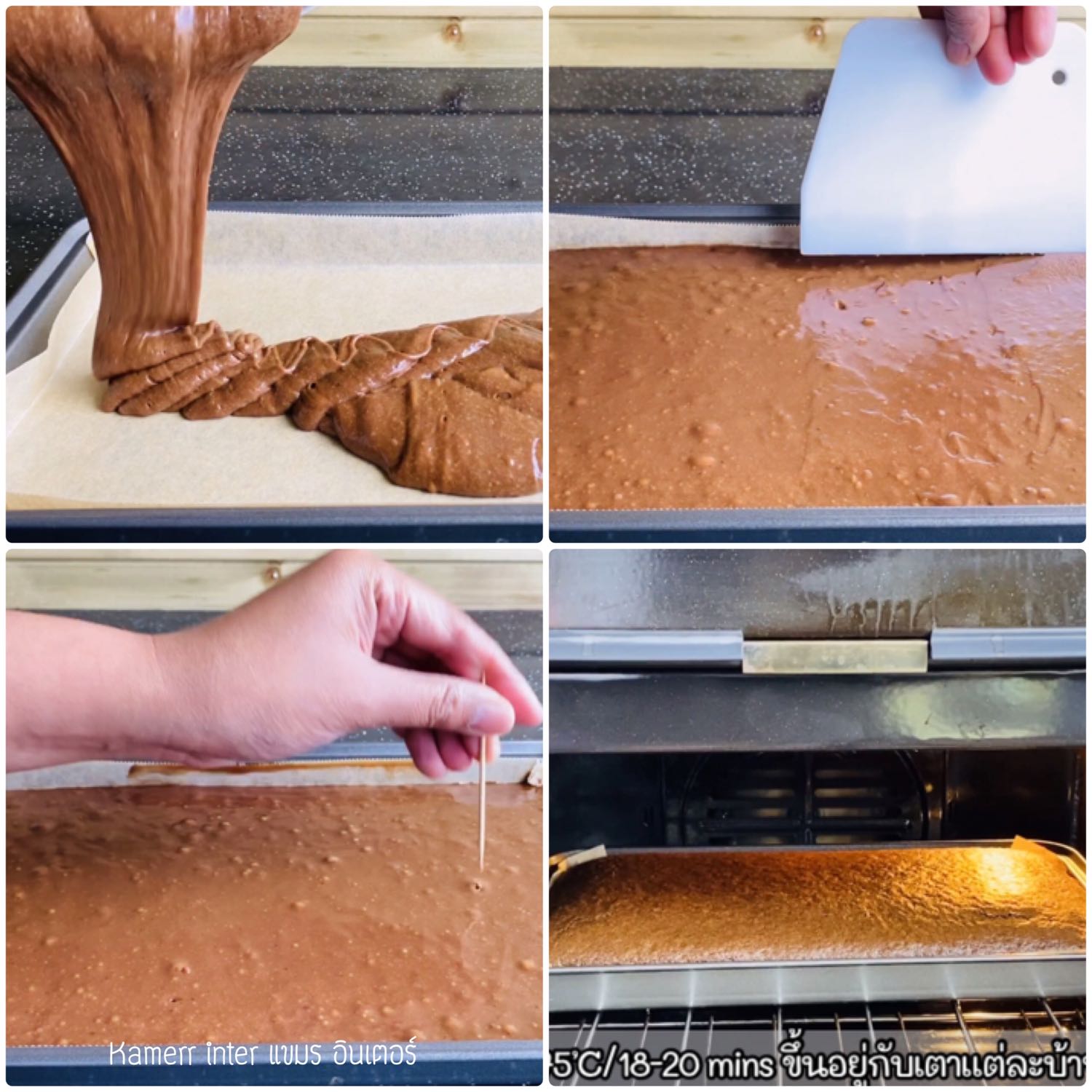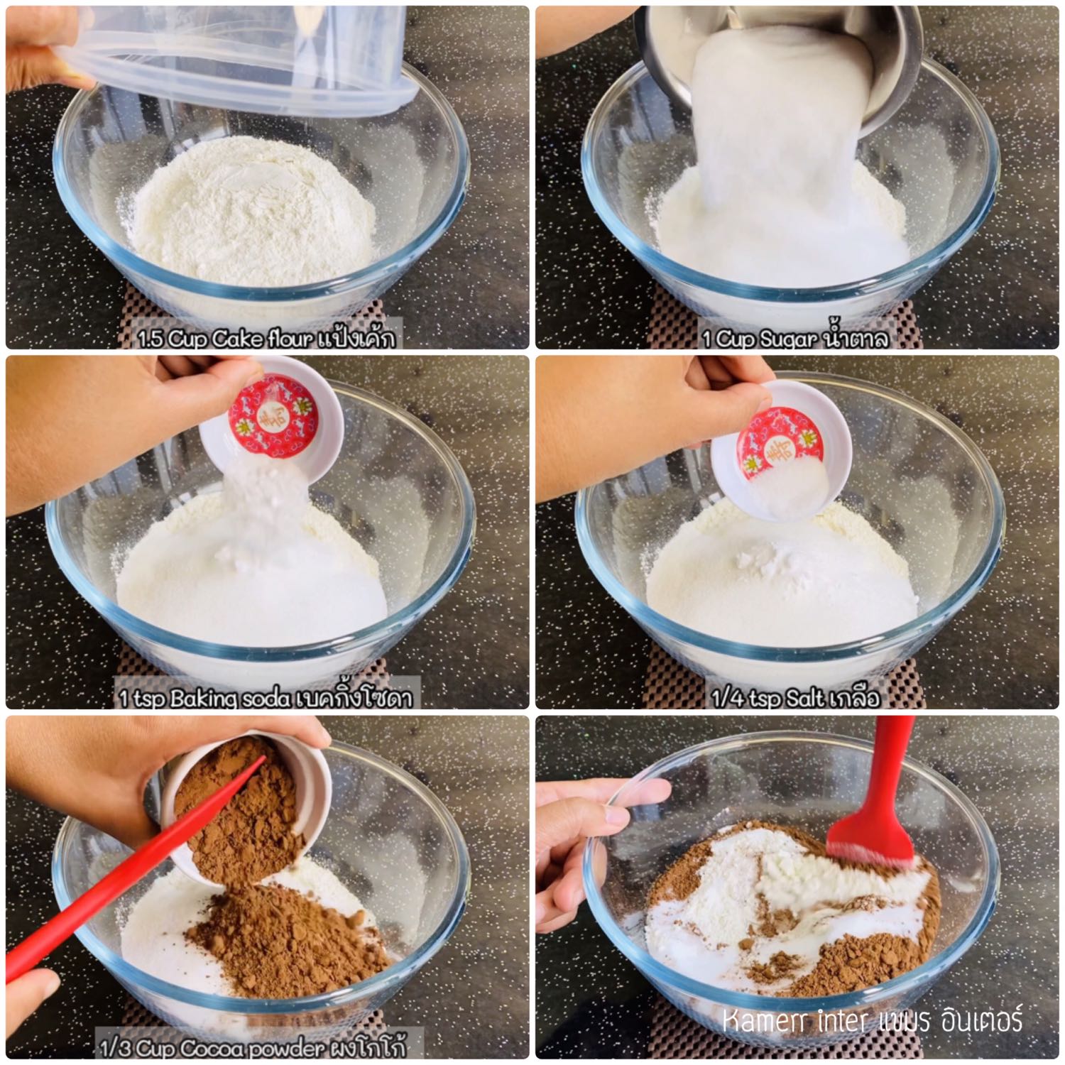 ทำการเทส่วนผสมของแห้งทั้งหมดรวมกัน ได้แก่ แป้งเค้ก, น้ำตาลทราย, เบคกิ้งโซดา, เกลือ และผงโกโก้