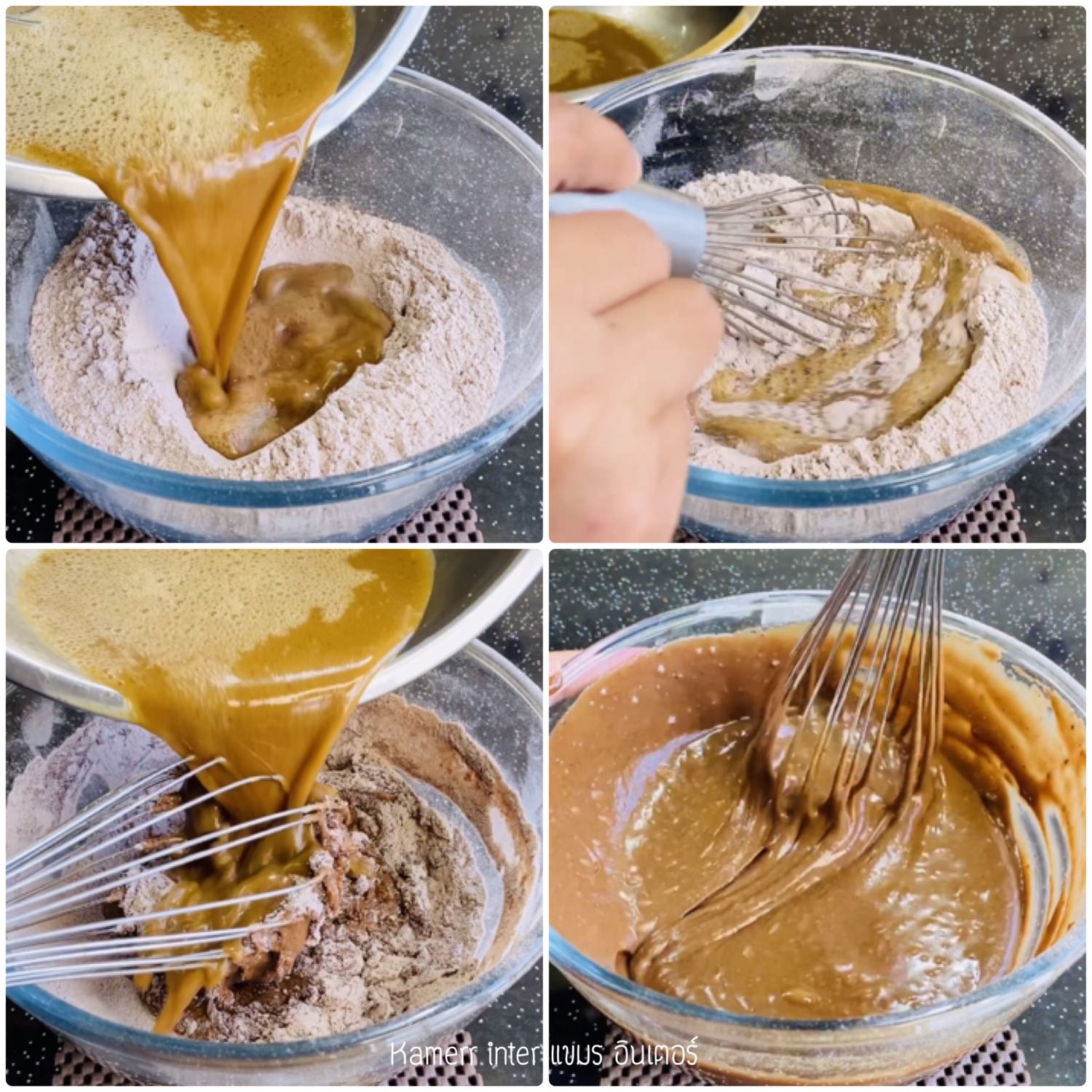 นำส่วนผสมของเหลว ค่อย ๆ เทใส่ในส่วนผสมของแห้งที่ร่อนรอไว้ คนให้ทุกอย่างเข้ากันดี