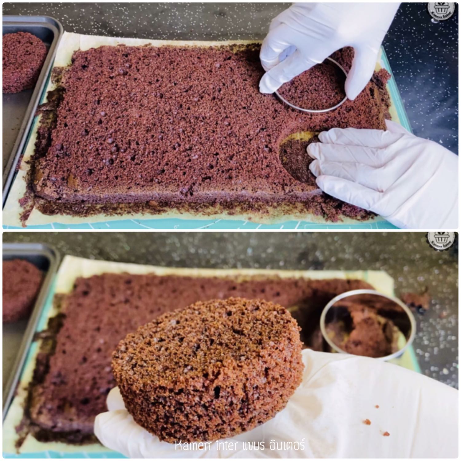 พักขนมให้เย็น ตัดส่วนนูนของเค้กออก และใช้ที่ตัดคุกกี้เจาะเอาขนาดตามต้องการ