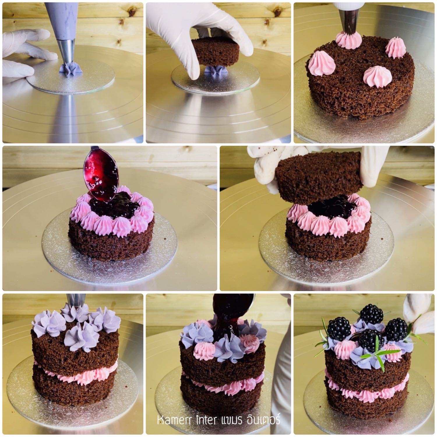 บีบครีมที่ฐานด้านล่างยึดเค้กกับแผ่นเค้ก จากนั้นวางเค้กลงไป บีบครีมใส่รอบ ๆ และตักซอสแบล็คเบอรี่ใส่ตรงกลาง