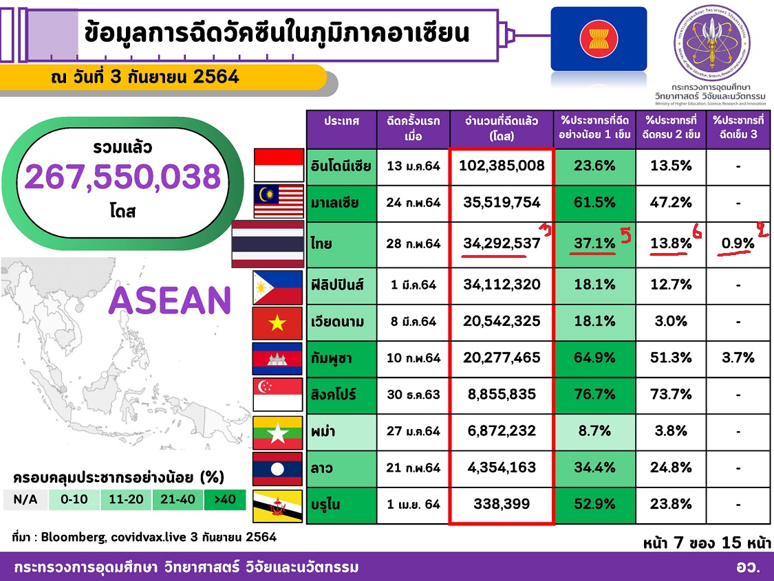 อันดับฉีดวัคซีนไทยในอาเซียน วันนี้ 3-5-6-2