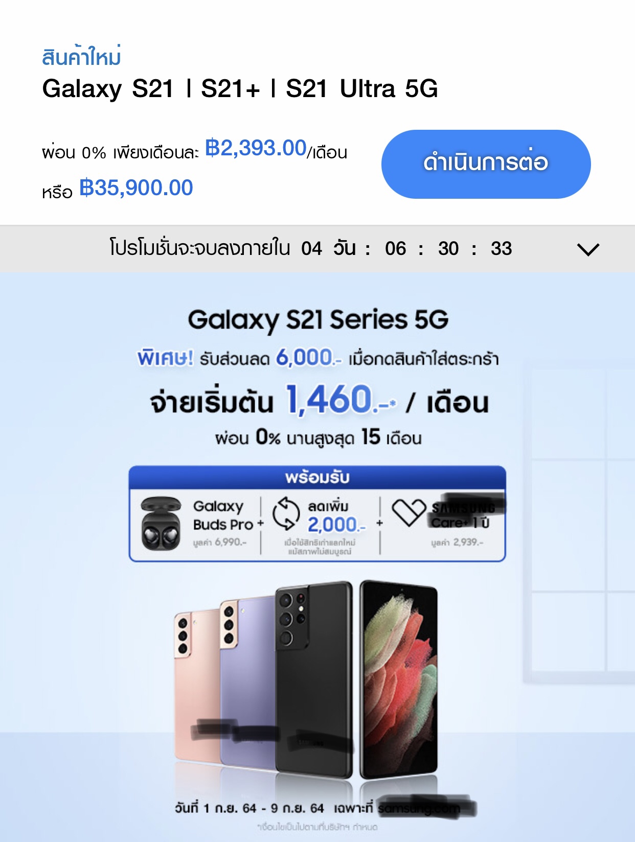 ผมได้จอง S21 Ultra 5G 16/512 Silver ไว้กับดีแทค ใช้เบอร์ Gold ลดค่าเครื่องเหลือ 32,400 บาท (ใช้รายเดือนดีแทค 1,000+ เท่าไรนี่แหละ) ชำระเงินจอง 2,000 บาท ไปเมื่อ 17 ม.ค.64 นัดรับเครื่อง 30 ม.ค.64 (รับ