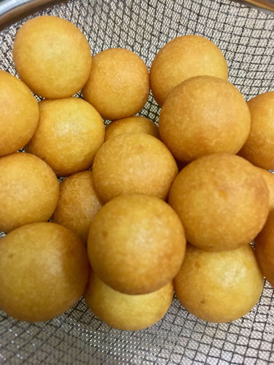 4. ตั้งกระทะใส่น้ำมัน เมื่อน้ำมันร้อนจัดแล้วนำแป้งไปทอด (ขั้นตอนนี้ใช้ตะหลิวหรือตะแกรงตักของทอดกดให้ขนมจมน้ำมันและค่อยๆคลึง ขนมจะฟูและกรอบนอกนุ่มในค่ะ)
