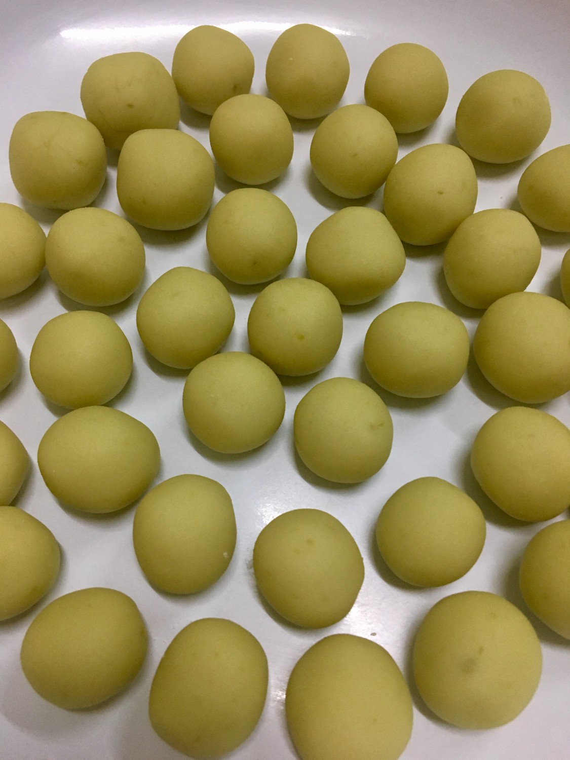 3. เมื่อผสมแป้งเสร็จแล้ว นำมาปั้นให้เป็นเม็ดกลมๆ ขนาดตามชอบ (ของเราประมาณเหรียญ 5 บาทค่ะ)