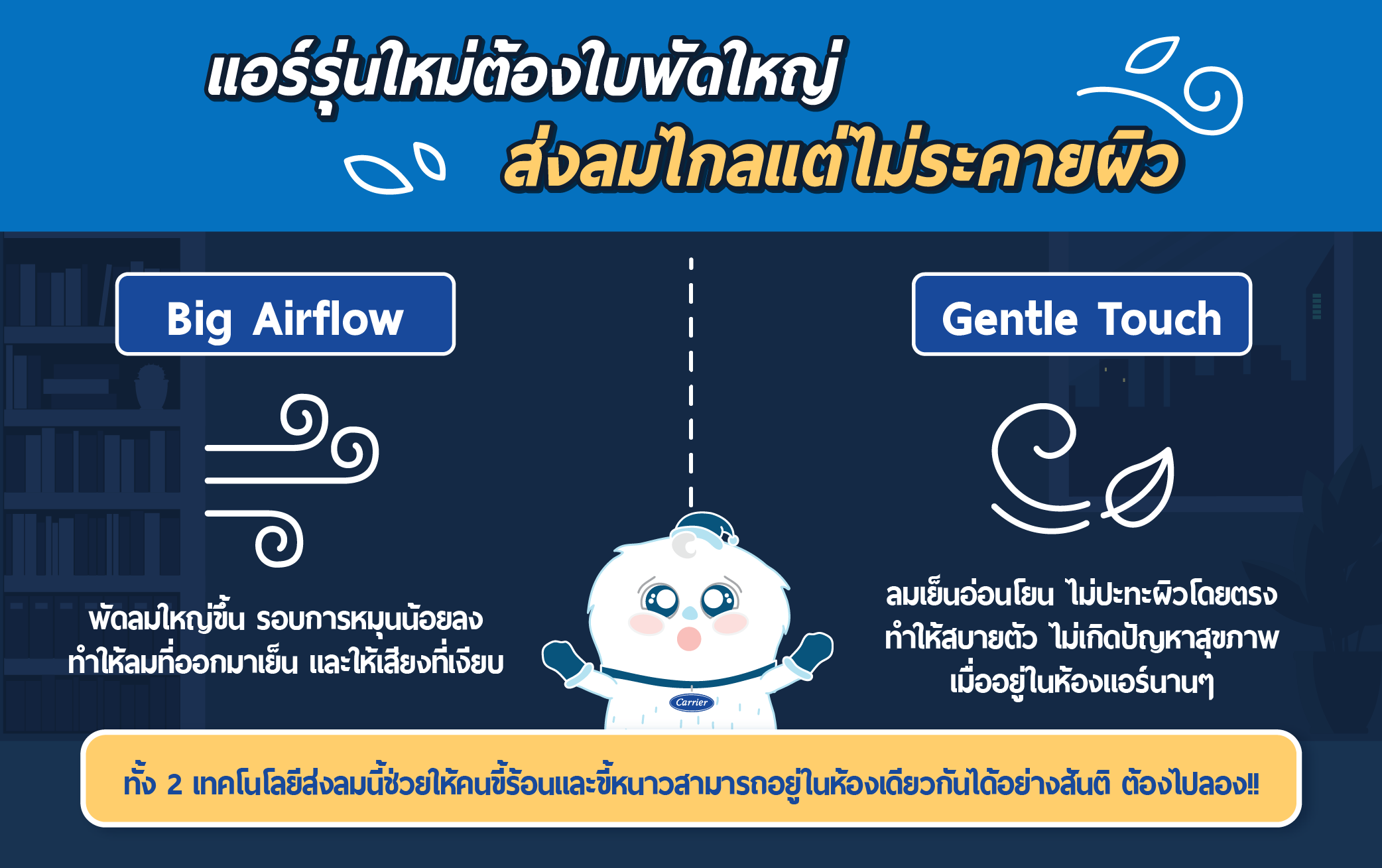 เมื่อก่อนคนขี้ร้อนกับคนขี้หนาวจะอยู่ห้องเดียวกันไม่ได้ เพราะคนนึงก็อยากจะได้ความเย็นแบบฉ่ำ แต่อีกคนอยากได้แค่เย็นแบบเบา ๆ ไม่ถึงกับหนาว ทำให้ตกลงกันค่อนข้างยากเพราะคนนึงก็อยากได้ลมแรง อีกคนอยากได้ลมเบา จะต้องมีคนใดคนนึงที่ต้องยอม แต่วันนี้!! เราจะพาไปรู้จักกับ 2 เทคโนโลยีส่งลมแบบใหม่ ที่จะทำให้ทั้งคนขี้ร้อนและขี้หนาวสามารถอยู่ในห้องเดียวกันได้อย่างสันติ