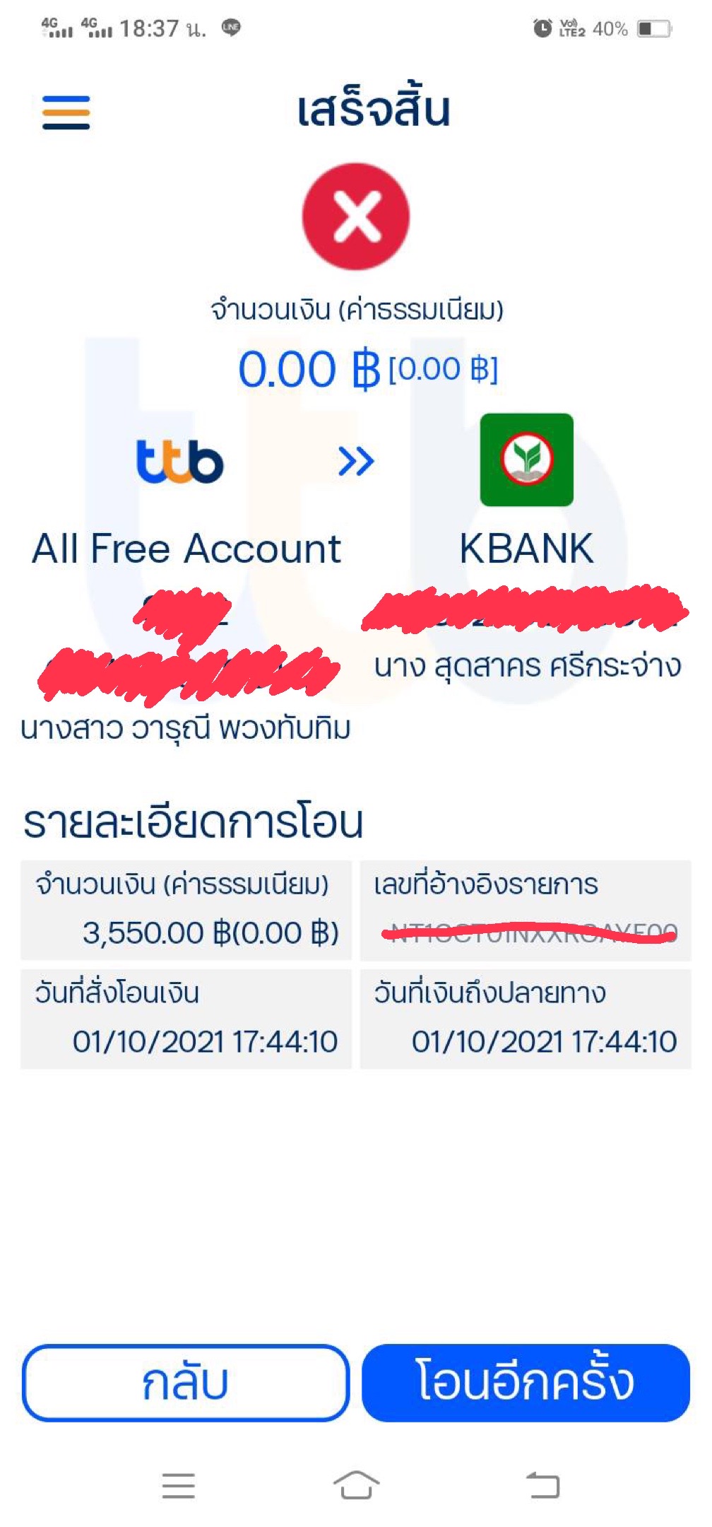 โอนเงินจากTTB ไปKbank ขึ้นโอนไม่สำเร็จแต่ยอดเงินในบัญชีถูกหักควรทำไงดีคะ