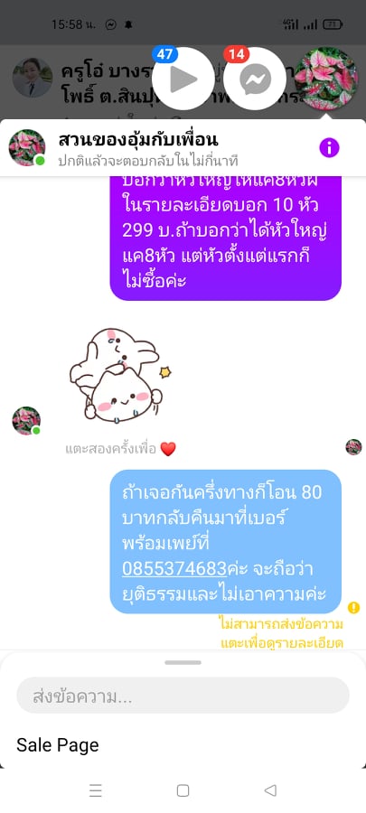 ซึ่งก่อนนหน้านั้น ลองทักไปให้โอนเงินมาคืน 80 บาท แต่จริงๆ คือต้องโอนคืน 60 บาท ตามจำนวนหัวที่ ขาด 2 หัว แต่เราทพิมพ์ผิด ด้วยความที่รีบและโกรธด้วยตอนนั้น แต่ทางเพจไม่ยอม หลังจากนั้น ก็เราก็โดนบล็อกไปเลย