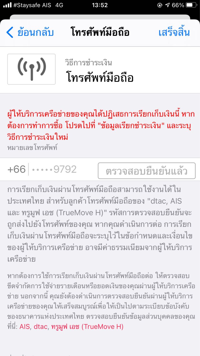 โดยปกติก็ตัดเงินซื้อแอปผ่านค่าโทร Ais ตลอด ระบบเติมเงิน แล้วมาโดนระงับ ให้ส่งเอกสาร ก็ส่ง ส่งแล้วบอกยกเลิกระงับก็ใช้ไม่ได้อยู่ดี รอทำเรื่องเกือบอาทิตย์ สรุปก็ใช