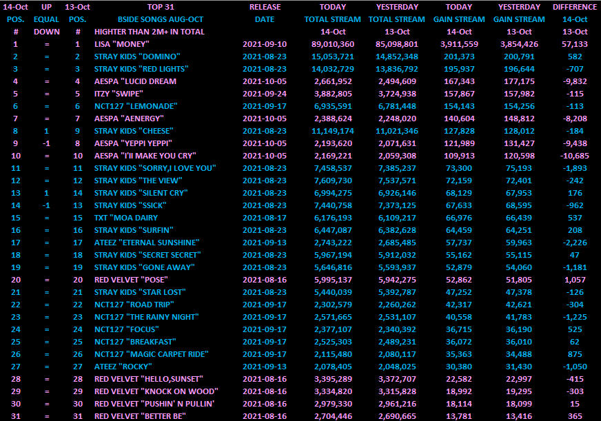 Top 31 B-Sides Songs 2021 Aug-Oct Daily Streams Oct 14