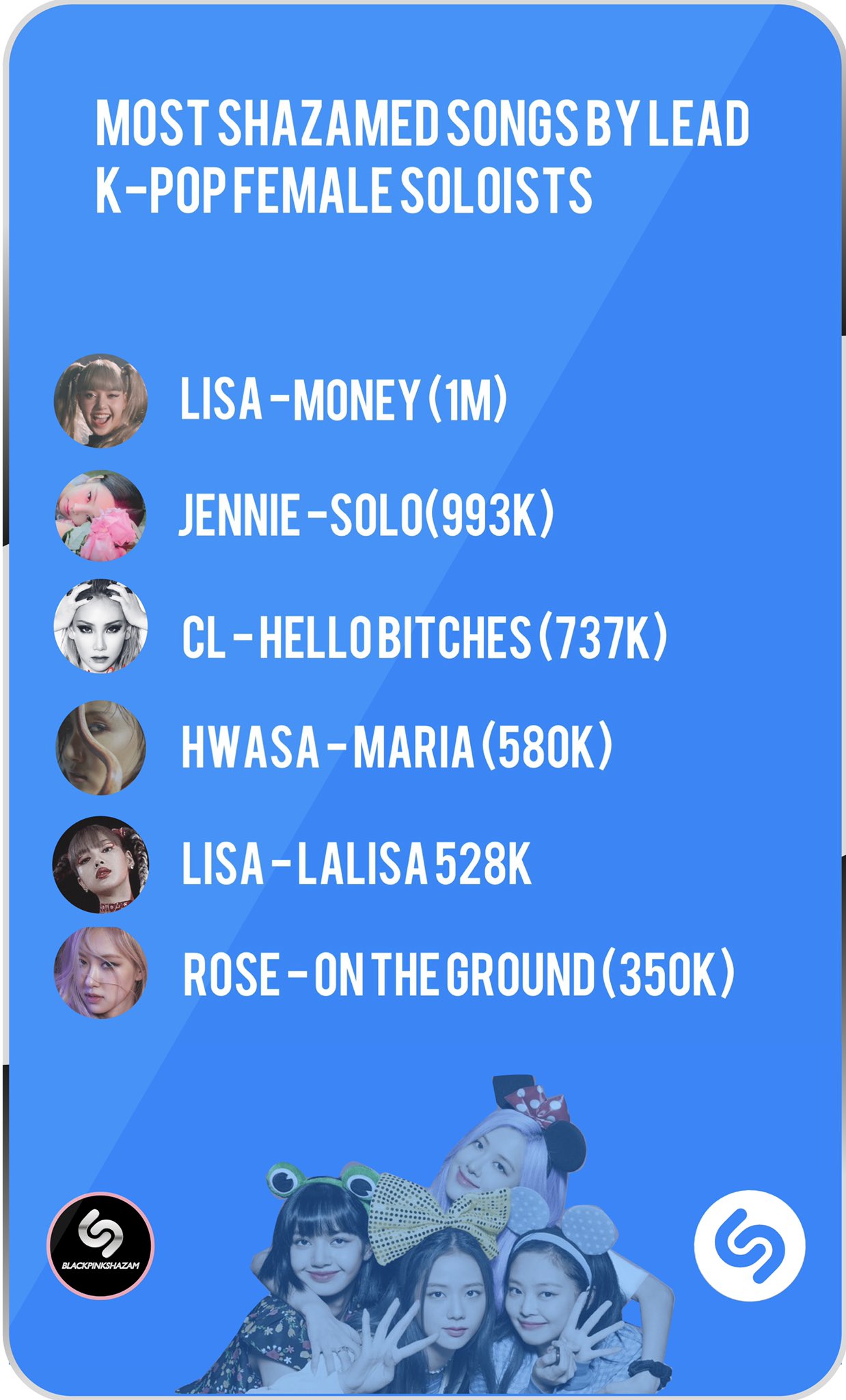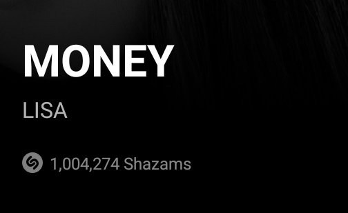 MONEY โดย LISA ทำสถิติเป็นเพลงที่เร็วที่สุดในประวัติศาสตร์ ของศิลปินหญิง K-POP ที่มียอดถึง 1 ล้าน บน Shazam ( 35 วัน 17 ชั่วโมง )