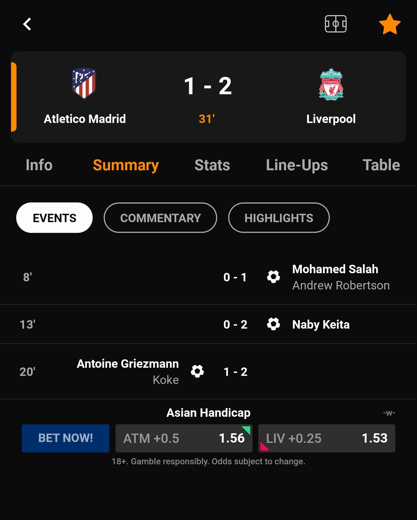 ลิเวอร์พูลขึ้นนำแอตมาดริด 2:0 ตั้งแต่ยังไม่ถึง 10 นาทีของครึ่งแรก และจบครึ่งแรกด้วยสกอร์ขึ้นนำ 2:1 มาครึ่งหลังมีหลายจังหวะที่มีโอกาสจะได้ขึ้นนำห่างเป็น 3 ประตูแต่ทำไม่ได้ โดยเฉพาะลูกยิงชนเสาของโมซาล่า
