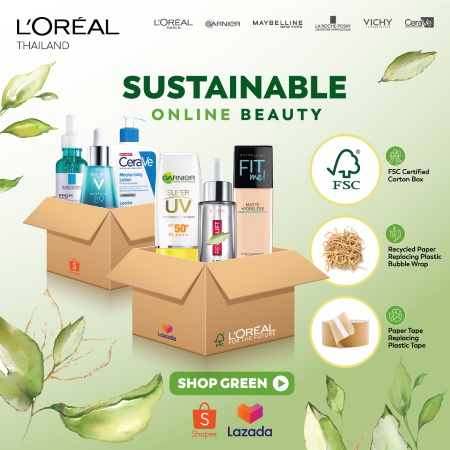 ผู้บริโภคที่สั่งซื้อผลิตภัณฑ์ของลอรีอัล ประเทศไทย ประกอบด้วย Garnier, Maybelline, L’Oréal Paris, La Roche-Posay, Vichy และ CeraVe ผ่านร้านทางการของแบรนด์จาก 2 แพลตฟอร์มอีคอมเมิร์ซชั้นนำอย่าง Shopee Mall และ LazMall จะได้รับการจัดส่งผลิตภัณฑ์ที่บรรจุไว้ในพัสดุที่เป็นมิตรต่อสิ่งแวดล้อมยิ่งกว่าที่เคย โดยการเลือกสรรวัสดุสำหรับหีบห่อพัสดุที่ยั่งยืน ด้วยการใช้กล่องกระดาษที่ได้รับการรับรองมาตรฐานสูงสุดระดับสากลด้านสิ่งแวดล้อมและป่าไม้จาก FSCTM* พร้อมกับใช้กระดาษสำหรับกันกระแทกทดแทนการใช้พลาสติก รวมถึงเทปกาวกระดาษ เพื่อมุ่งลดปริมาณการใช้พลาสติกที่คาดว่าจะสามารถลดได้กว่า 300 ตันต่อปีจากพัสดุจำนวน 1,000,000 กล่อง