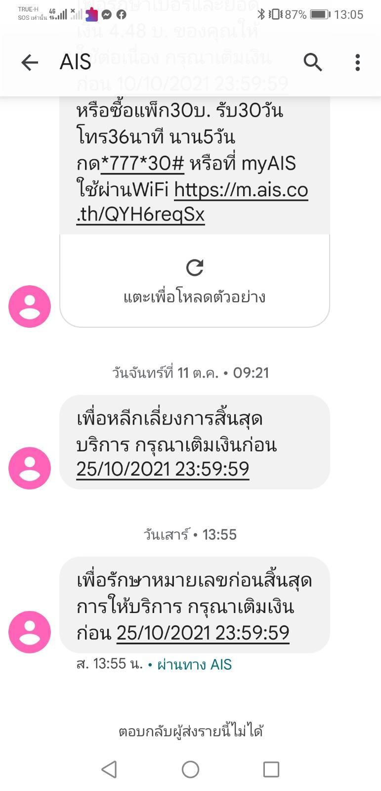 เนื้องจาก ais ส่งข้อความว่าสัญญาจะไม่สามารถใช้ได้ในคืนนี้ (วันที่ 22 พ.ย. 64) เมื่อวานติดต่อขอเลื่อนชำระค่าบริการเป็นวันที่ 25 พ.ย. 64 ทางพนักงาน