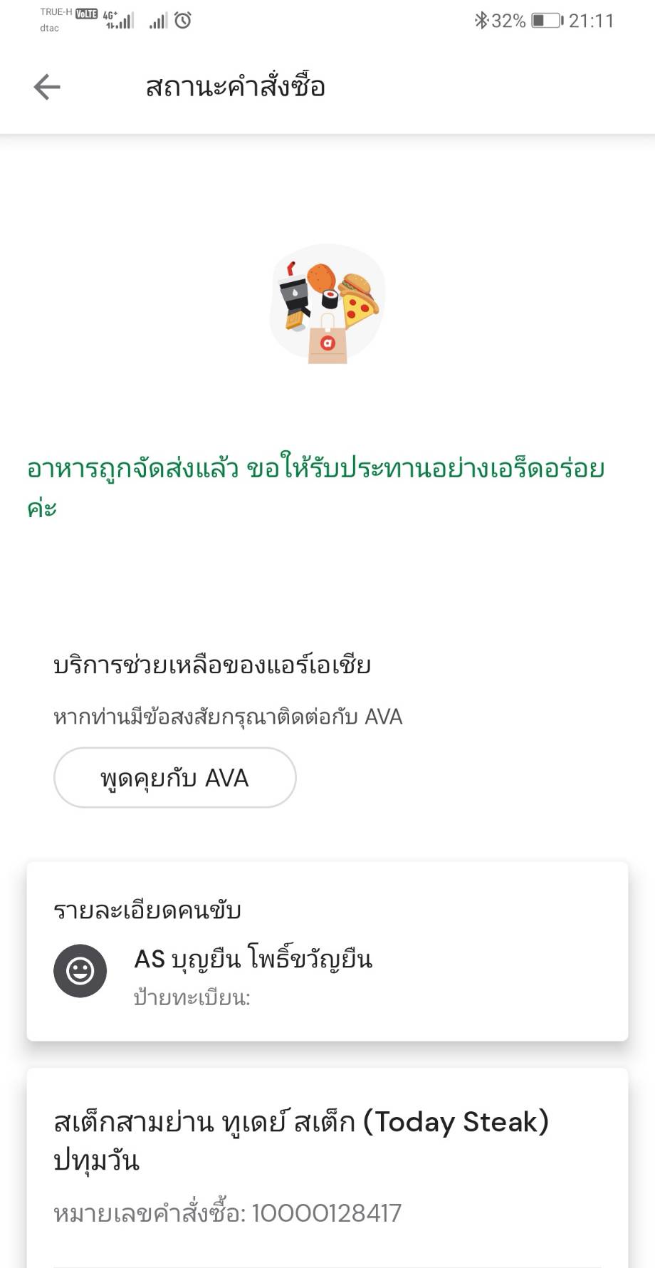 31 ต.ค. ผมสั่งซื้ออาหารมาส่งที่โรงงาน ทำงานอยู่ในออฟฟิศรอเป็นชั่วโมง ดูสถานะในแอพตลอดแต่ไม่มีการอัพเดทหรือการติดต่อจากไรเดอร์ (ทั้งโทรและแชท) ณ เวลา 14:07 จนกระทั่งแอพขึ้นคำสั่งซื้อเสร็จสิ้นผมจึงกดราย