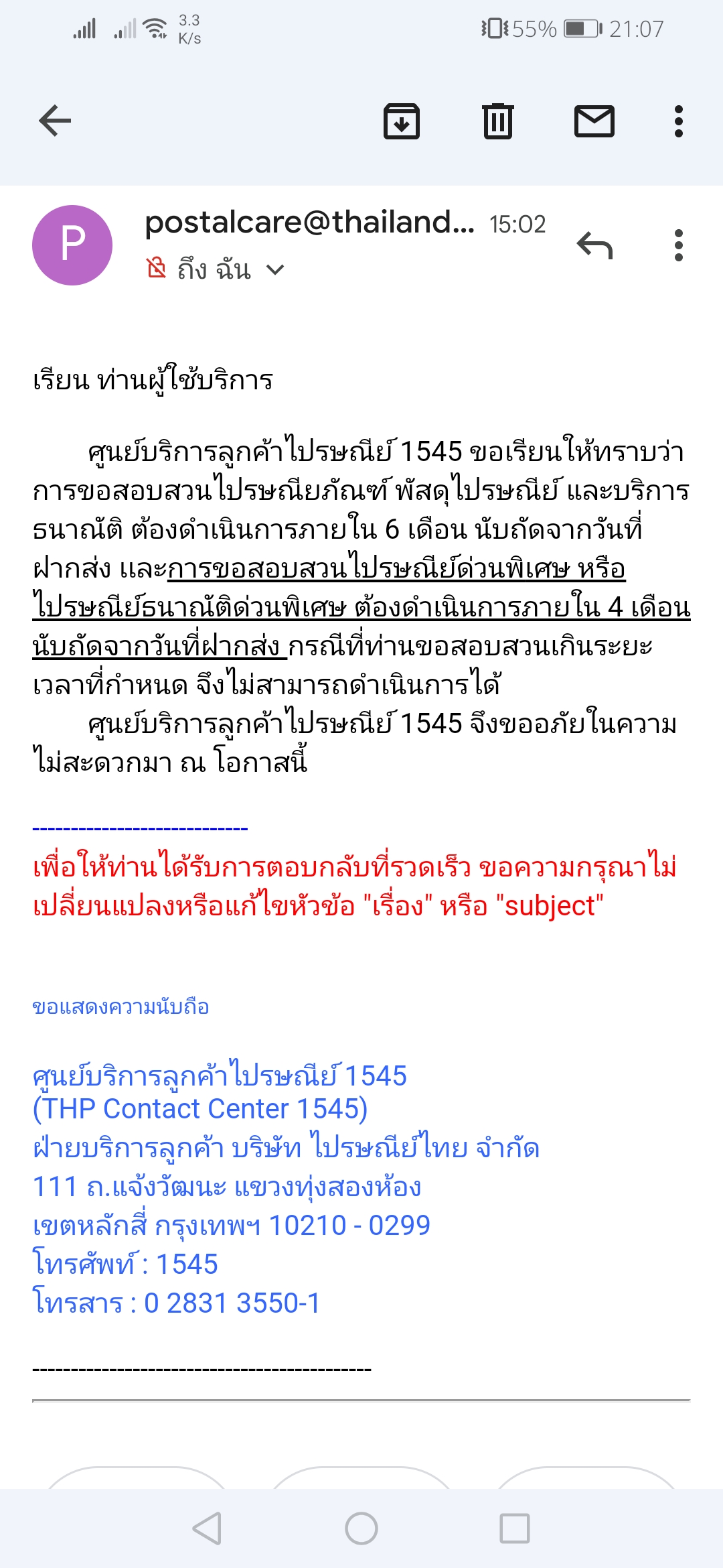 สั่งของจากเว็บเพลเป็นซิมรายปี สั่งไปตั้งแต่เดือนกุมภาพันธ์ 2564 สั่งไปลงที่บ้านไว้ แต่ไม่ได้ติดตามว่าที่บ้านได้รับของแล้วยัง (ผมทำงานต่างจังหวัด) จนที่บ้านถ่ายรูปมาให้ดูว่ามีของมาส่ง เป็นซิมที่สั่งไว้ตั้งแต่เดือนกุมภาพันธ์โน้นล่ะ พึ่งจะมาส่งให้เดือนตุลาคม ส่งแบบ EMS ด้วย นานมากๆ เสียเงินค่าซื้อซิมไป 1529 บาท แล้วซิมก็เลยกำหนดเปิดใช้งานไปแล้วด้วย (กำหนดเปิดใช้ซิมก่อนวันที่ 31 กรกฏาคม 2564) เลยลองส่งอีเมลร้องเรียนไปที่ไปรษณีย์ เขาก็ตอบกลับมาว่าเลยระยะเวลาที่จะร้องเรียนแล้ว