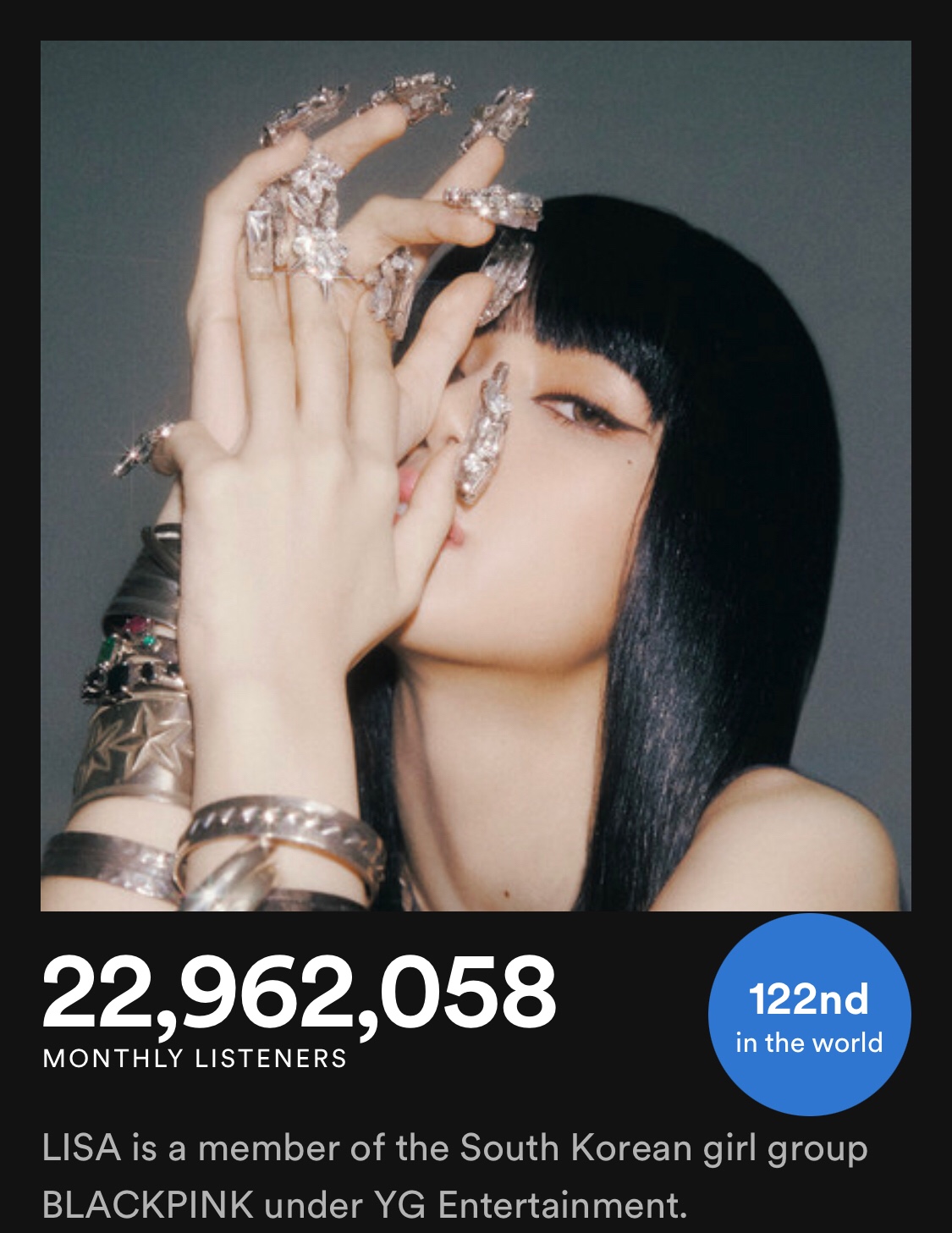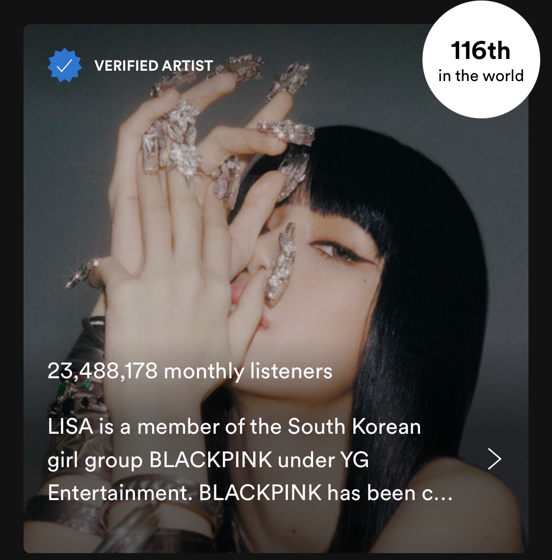 LISA มียอดผู้ฟังรายเดือนบน Spotify มากกว่า 23 ล้านรายแล้ว