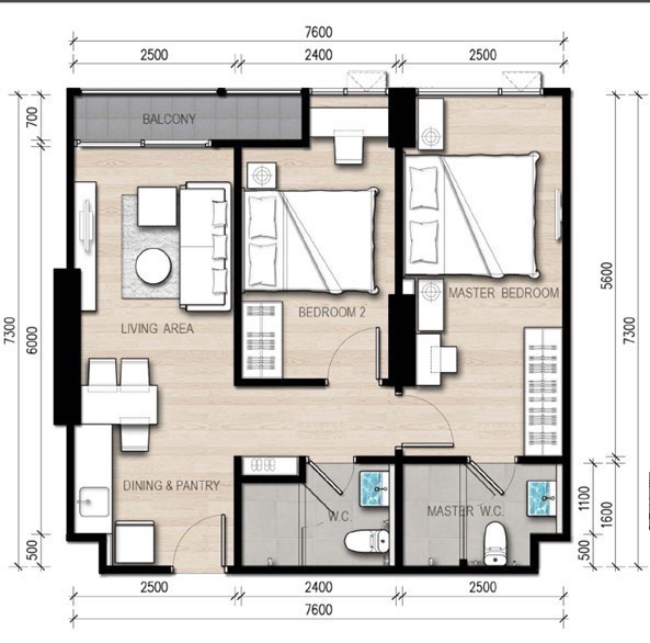 ห้องมุม 2 ห้องนอน 2 ห้องน้ำ