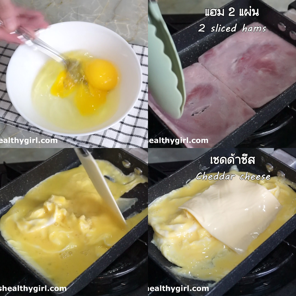 - ตั้งกระทะ ทาน้ำมันลงไปบางๆ นำแฮม 2 แผ่นลงไปอุ่นประมาณ 1-2 นาที เสร็จแล้วตักขึ้นพักไว้