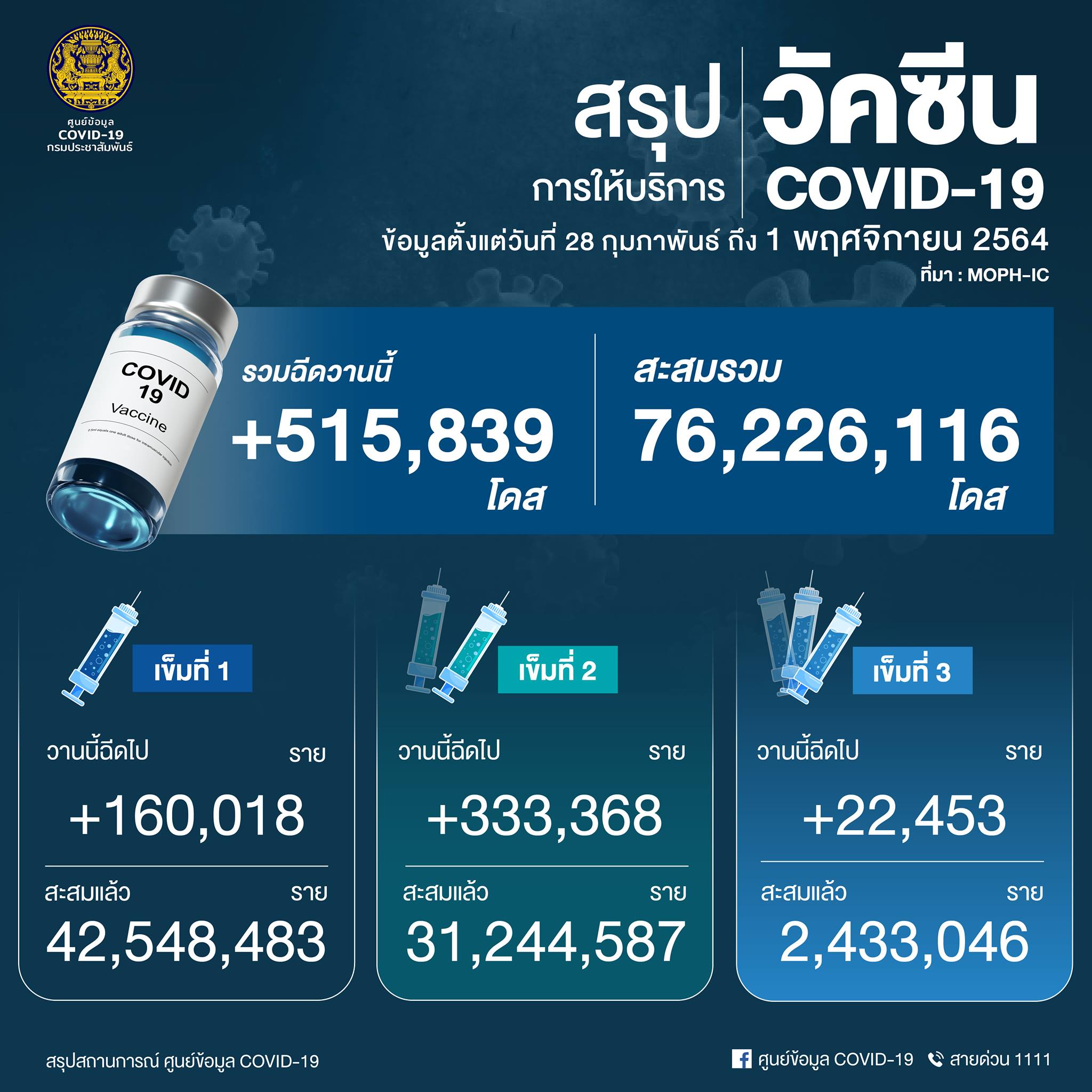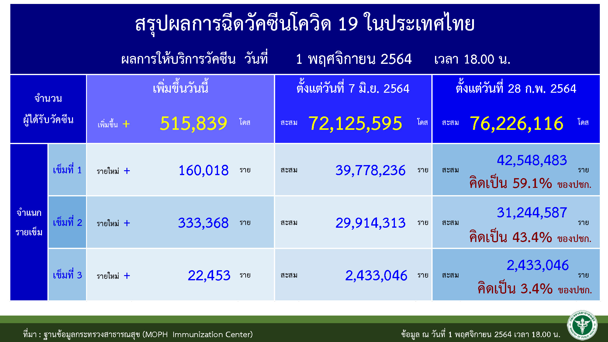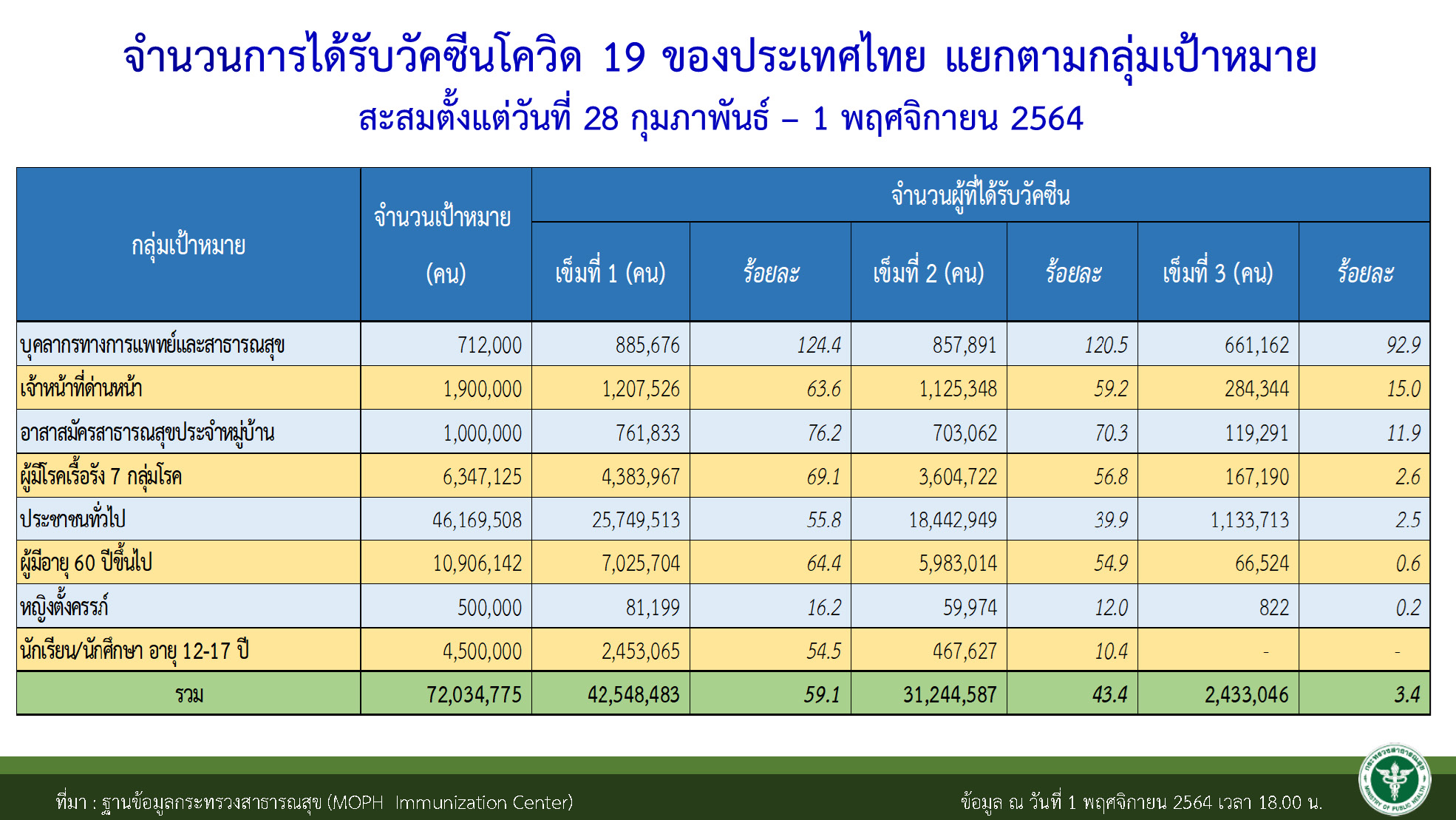 ภาพรวมยอดฉีดวัคซีน วันที่ 1 พฤศจิกายน 2564