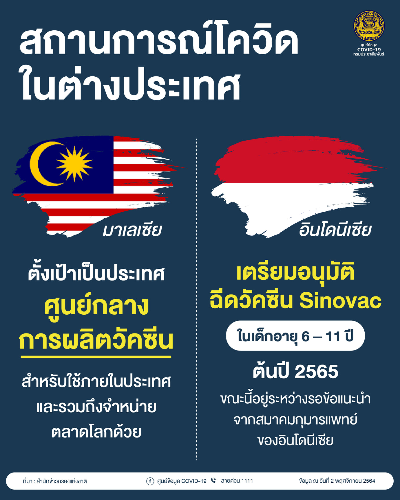 • อินโดนีเซียเตรียมอนุมัติฉีดวัคซีน Sinovac ในเด็กอายุ 6 – 11 ปี ต้นปี 2565 ขณะนี้อยู่ระหว่างรอข้อแนะนำจากสมาคมกุมารแพทย์ของ ทั้งนี้ ข้อมูลของรัฐบาลอินโดนีเซียระบุว่าการติดเชื้อ COVID-19 ในเด็กอายุ 0-18 ปี คิดเป็นร้อยละ 13 ของจำนวนผู้ติดเชื้อทั้งหมด