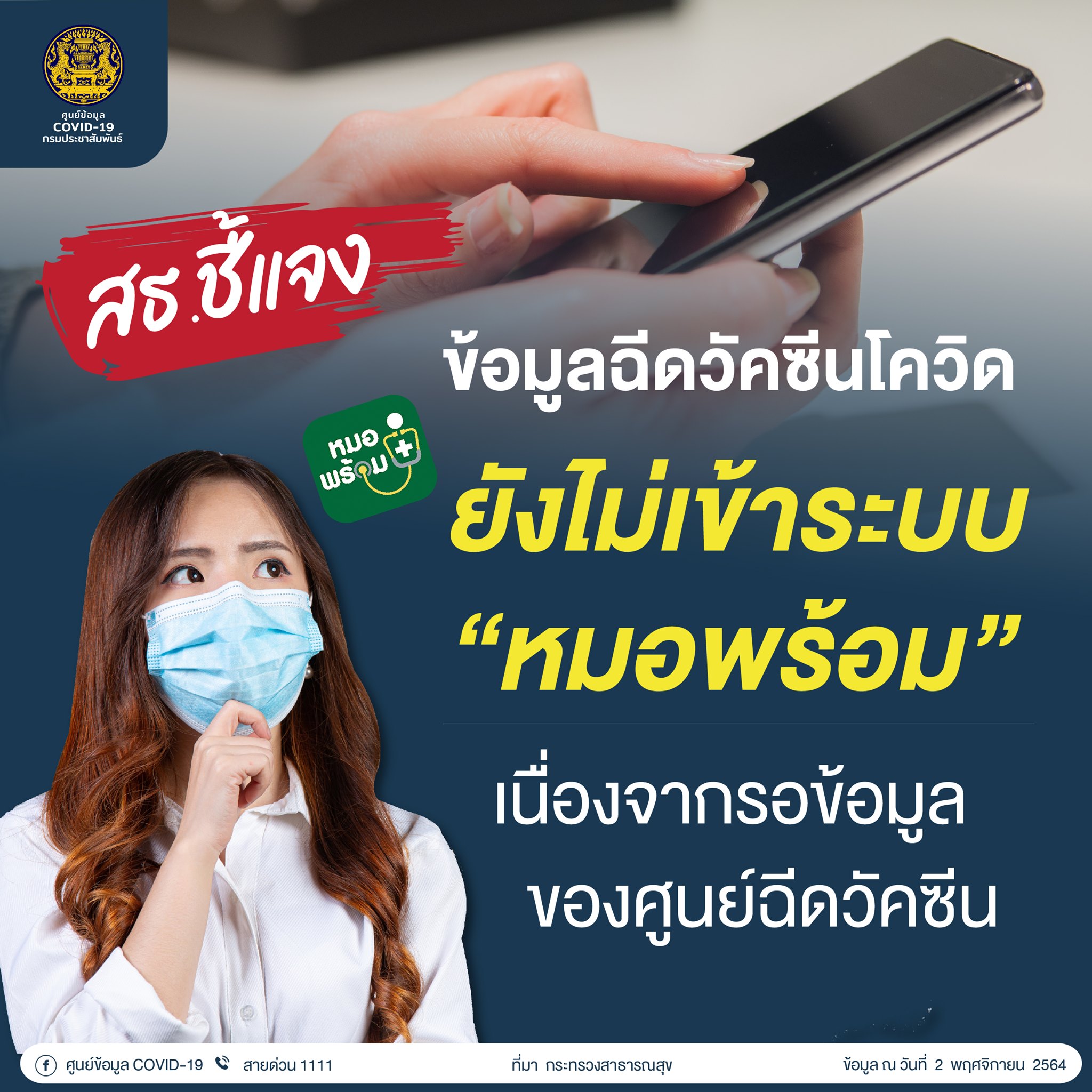 ส่วนกรณีผู้ฉีดวัคซีนโควิด แล้วไม่มีข้อมูลปรากฏในระบบหมอพร้อม ทำให้ไม่มีข้อมูลในการนัดฉีดเข็มต่อไป หรือไม่มีข้อมูลใน Digital Health Pass และไม่สามารถออกใบรับรองการฉีดวัคซีนเพื่อการเดินทางได้นั้น ปัญหาเกิดจากหน่วยบริการฉีดวัคซีนยังไม่ได้ลงบันทึกข้อมูล เนื่องจากเป็นการฉีดนอกสถานที่ หรือการฉีดวัคซีนตามโครงการต่าง ๆ เช่น ไทยร่วมใจ ราชวิทยาลัยจุฬาภรณ์ ประกันสังคม เป็นต้น ซึ่งหน่วยบริการต้องส่งข้อมูลให้เจ้าของโครงการตรวจสอบก่อนแล้วค่อยบันทึกลงระบบของกระทรวงสาธารณสุข จึงทำให้มีการแสดงผลล่าช้า ขณะนี้ได้ประสานหน่วยบริการฉีดวัคซีนและโครงการต่าง ๆ ให้เร่งบันทึกผลการฉีดวัคซีน และขอให้ประชาชนที่รับวัคซีนแล้วตรวจสอบข้อมูลต่าง ๆ ให้ถูกต้อง ทั้งชื่อ นามสกุล เลขบัตรประจำตัวประชาชน ส่วนผู้ที่ฉีดวัคซีนแล้วยังไม่มีข้อมูลในระบบหมอพร้อม ขอให้ติดต่อหน่วยบริการฉีดวัคซีนหรือเจ้าของโครงการเพื่อติดตามความคืบหน้า ทั้งนี้ หากมีการลงข้อมูลเรียบร้อย ระบบหมอพร้อมจะแสดงผลได้ทันที