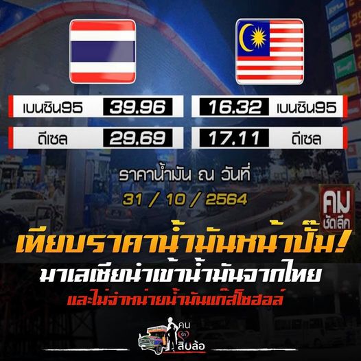 เห็นเพจ  เขาลงว่ามาเลเซียน้ำเข้าน้ำมันจากไทย  แต่ราคา  มาเลถูกกว่าเฉย     ตามความเข้าใจผม มาเล  มีบ่อน้ำมันเป็นของตัวเองมากกว่าไทย  แถมส่งออก เยอะกว่า  เขาเลยสามารถทำให้น้ำมันบ้านเขาราคาถูกกว่าได้     ประเทศเรา น้ำมัน มีน้อย  แต่ปริมาณการใช้ มันมากกว่าน้ำมันที่มี  เลยทำให้เราต้องนำเข้า  น้ำมันต่างประเทศ