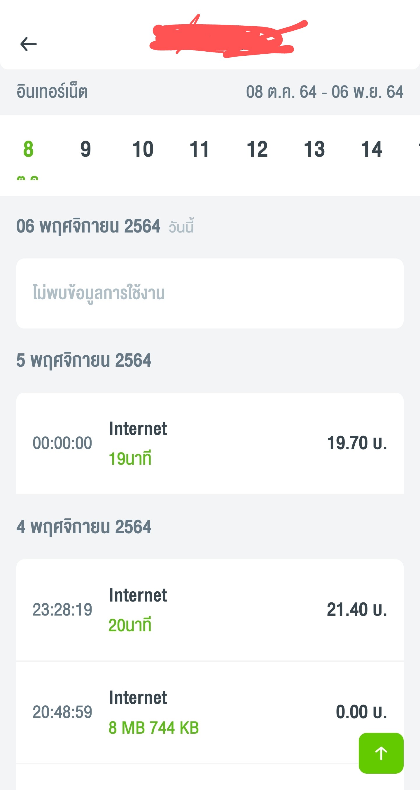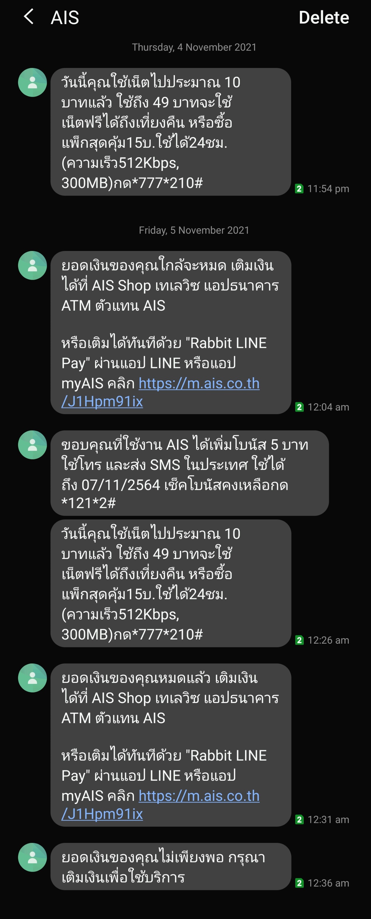 วันต่อมา ผมพบว่ามีข้อความเข้ามา แจ้งว่า "ยอดเงินของคุณหมดแล้ว" ผมตกใจมากว่าเงินจำนวน 41.10 บาทถูกตัดจนหมดได้ยังไง จึงรีบเข้าไปเช็คในแอป myAIS พบว่ามีอินเตอร์เน็ตถูกใช้งานวันที่ 4/11/64 เวลา 23:28 น. ซึ่งในเวลานั้นผมไม่ได้มีการใช้งานอินเตอร์เน็ตเลย!!!