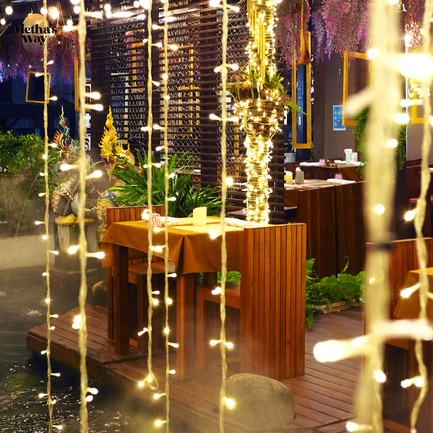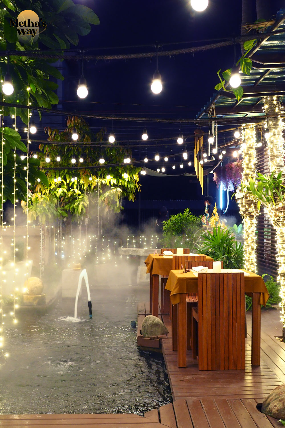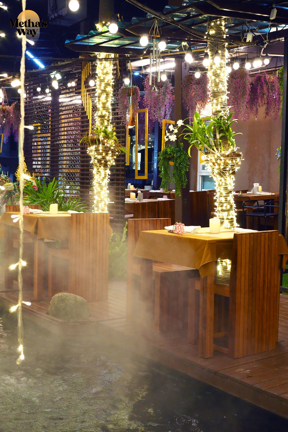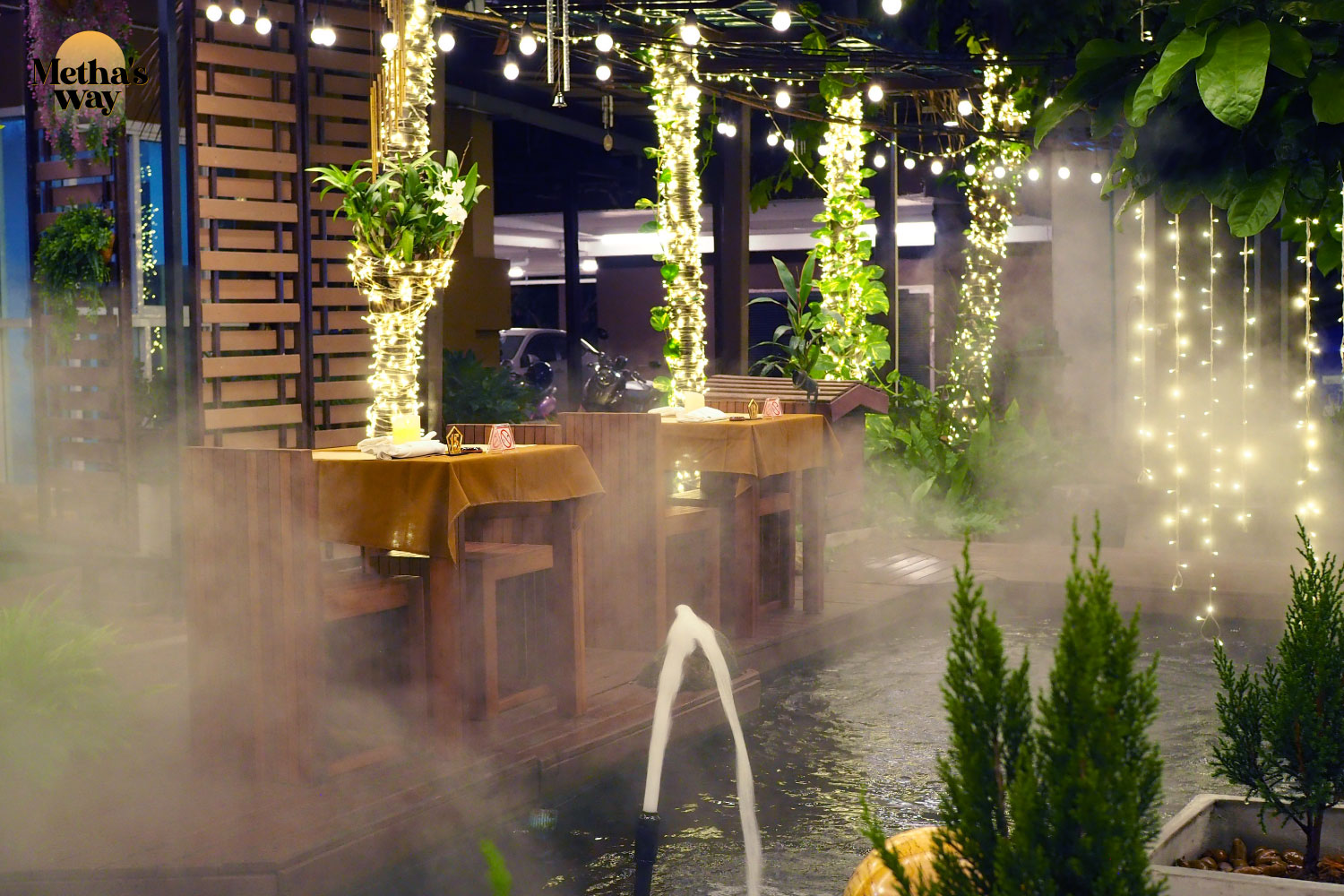 บรรยากาศกลางคืน ร้านจะเปิดไฟ และไอน้ำโซนด้านนอกให้