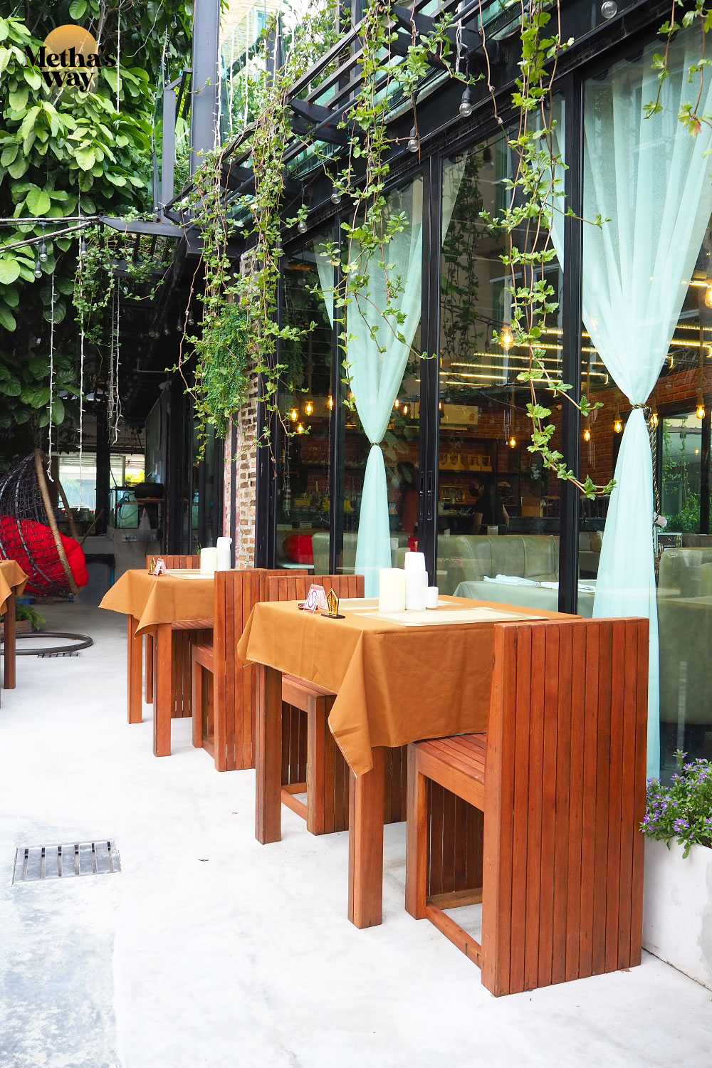 สว่าง โปร่ง มีต้นไม้ โต๊ะส่วนใหญ่จะเป็นโต๊ะคู่