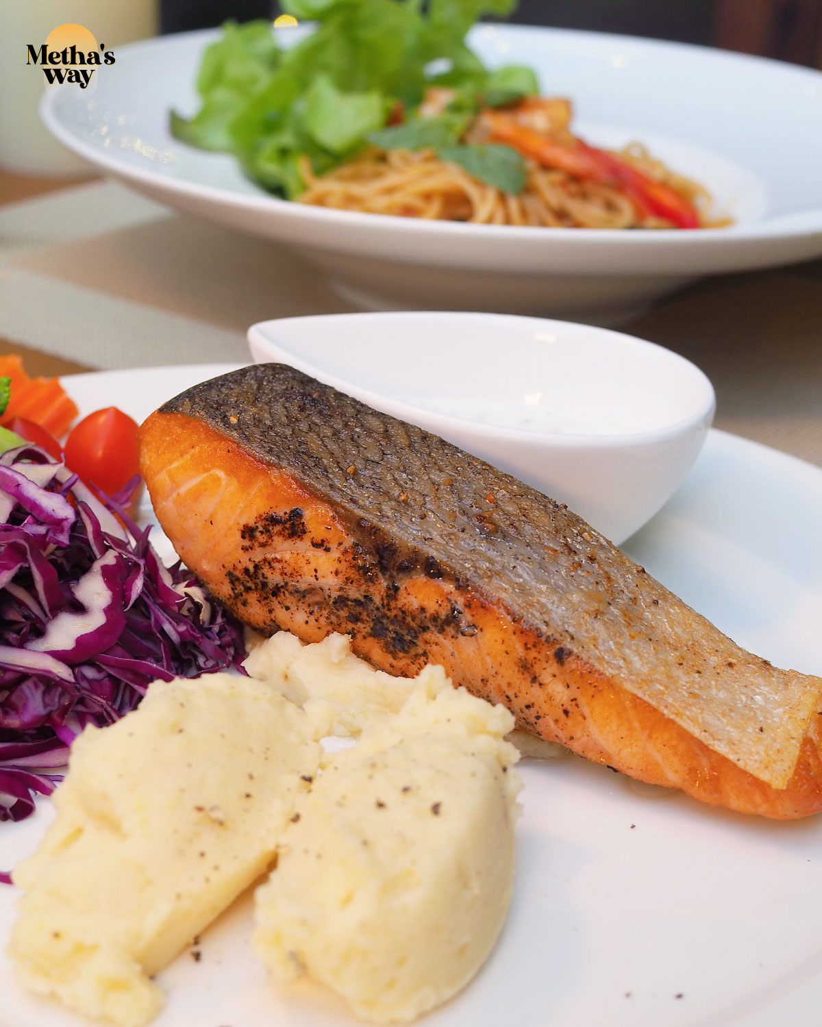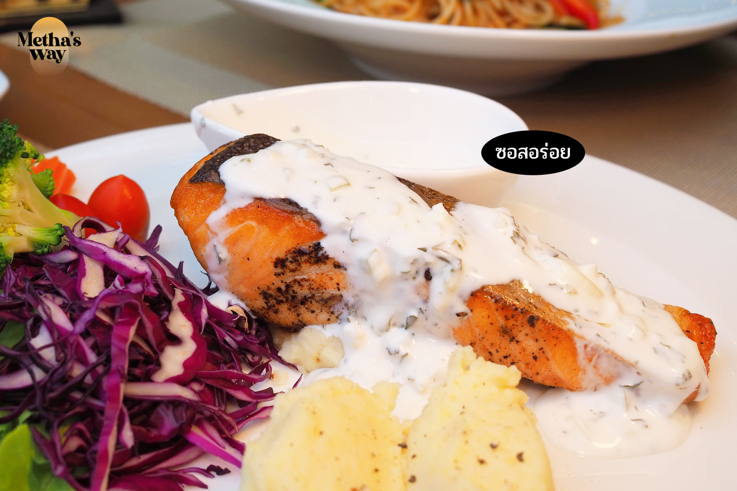 สเต็กแซลมอนซอสครีมทาร์ทาร์ และมันบด (389.-)เป็นจานที่ชอบอันดับ 1 ในบรรดาทุกเมนูที่สั่งมา