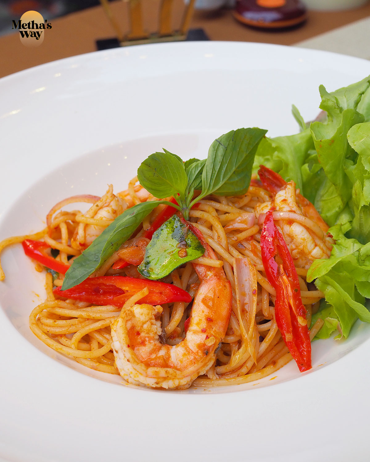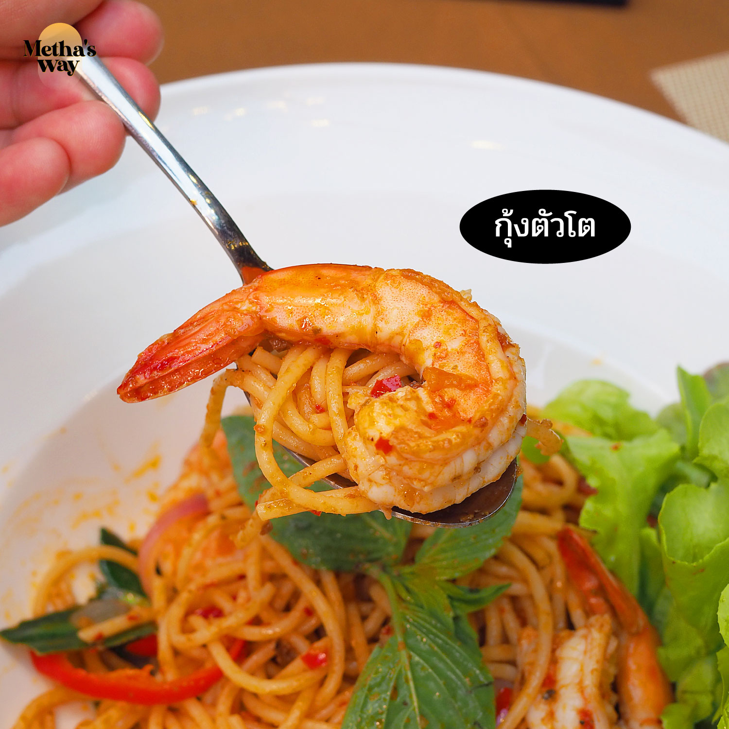 สปาเก็ตตี้ต้มยำกุ้ง (119.-)รสชาติเข้มข้นถึงตัวเส้นสปาเก็ตตี้ มีความเผ็ดปลายเล็กน้อย
