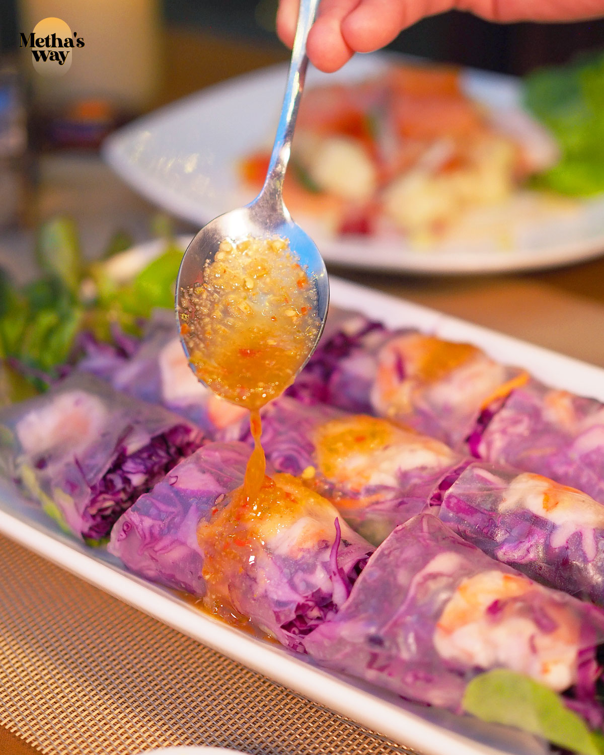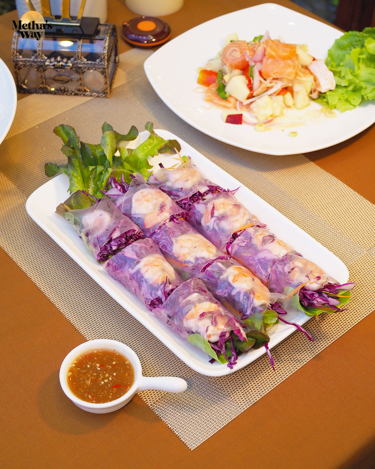ปอเปี๊ยะสดกุ้งคั่วพริกเกลือ (179.-)ผักแน่นล้นคำ เน้นไปทางผักสลัด และกะหล่ำม่วงนะคะ