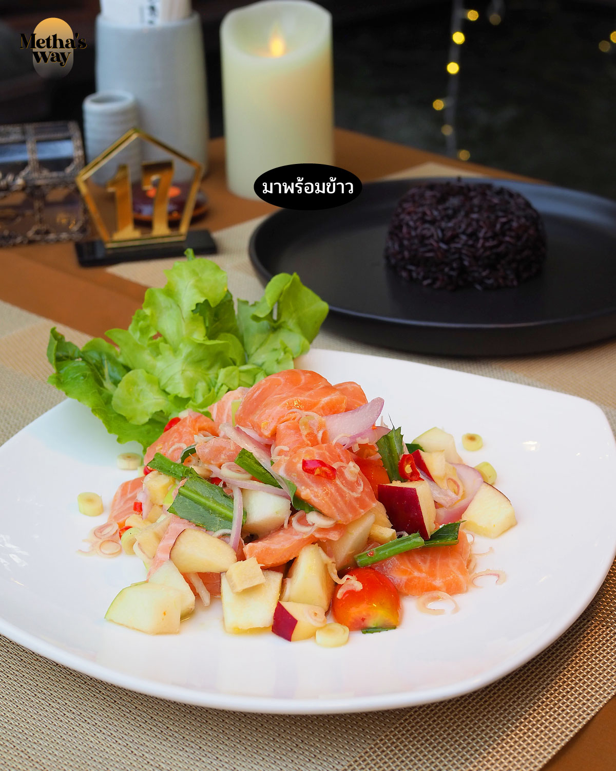 แซลมอนซาซิมิลุยสวน (219.-)จานนี้จะเสิร์ฟพร้อมข้าวไรซ์เบอร์รี่ที่แน่น หอม อร่อย