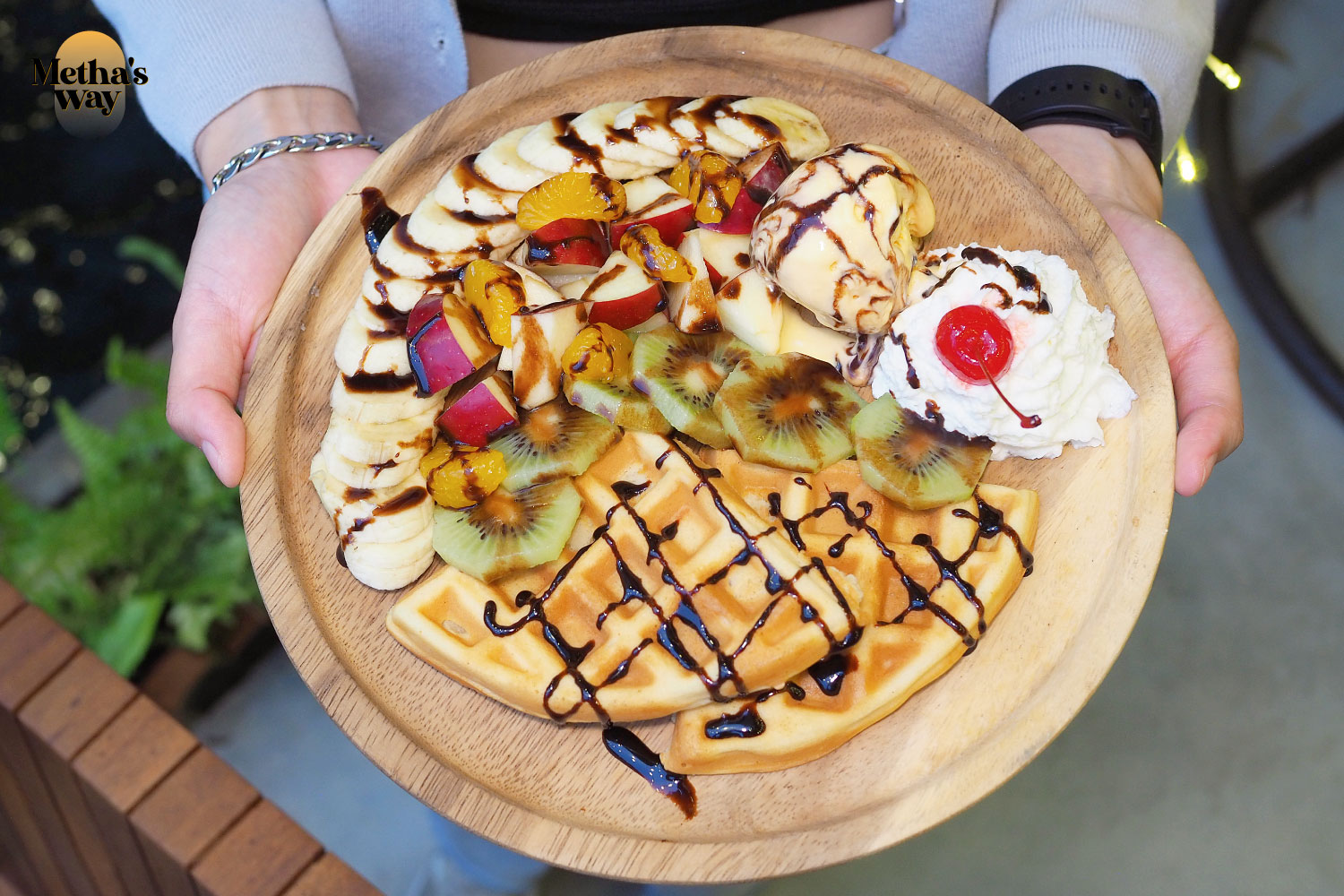 วาฟเฟิลผลไม้รวม (110.-)ปิดท้ายเมนูของหวานเราเลือกเป็นวาฟเฟิลผลไม้รวม