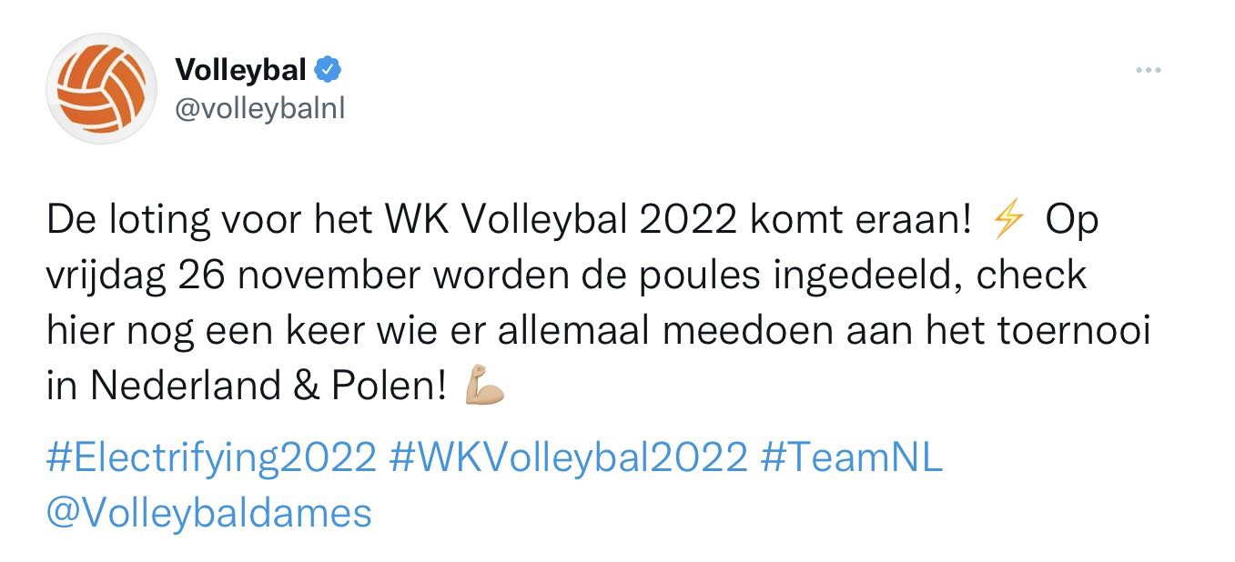 “De loting voor het WK Volleybal 2022 komt eraan! ⚡ Op vrijdag 26 november worden de poules ingedeeld, check hier nog een keer wie er allemaal meedoen aan het toernooi in Nederland & Polen! 💪🏼”