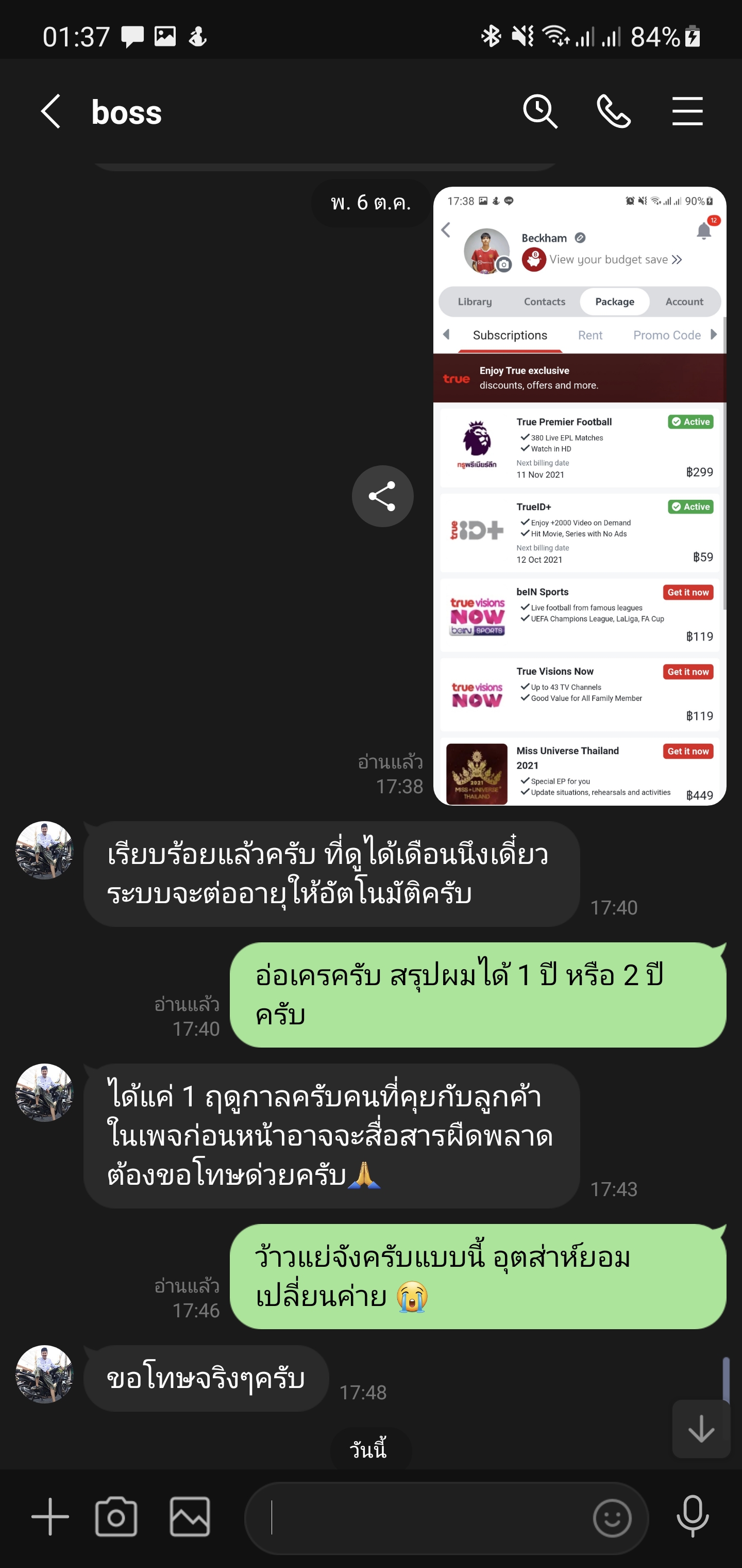 สวัสดีครับ รบกวนสอบถามครับ วันนี้ผมได้ทำการสมัครแพคเกจเสริมของ True ID สำหรับไว้ดูฟุตบอลพรีเมียร์ลีก โดยสมัครแบบเหมาทั้งฤดูกาล 2,500 บาท โดยได้สมัครผ่านแอพ True ID และมีการตัดเงินจากบัตรเรียบร้อย แต่พ