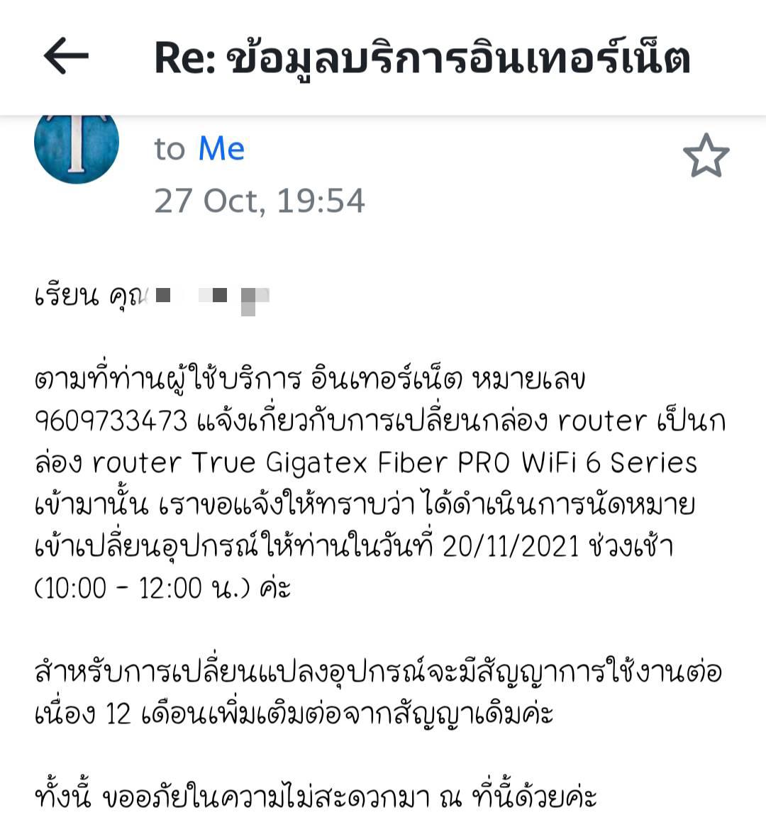 เนื่องจากตอนที่ขอไปเราขอกล่องเร้าเตอร์หกเสาแต่ตอนมาติดตั้งกลับได้แบบสี่เสา พอสอบถามไปบอกว่าของหมดเลยแจ้งว่ามีของให้นำมาเปลี่ยนด้วย ตามเมล์นัดวันนี้ 20.11.64 เวลา 10.00-12.00 ตอนนี้ 12.08 ยังไม่มี จนท ติดต่อมา ไม่มีใครดำเนินการอะไรทั้งสิ้น ทำงานได้ห่วยแตกมาก เสียเวลา