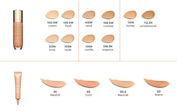 ส่วนผสมของ Skin Tone Optimizing Complex ที่ประกอบไปด้วยเม็ดสี, Pink Pearl (อณูไข่มุกสีชมพู ) และ Soft-Focus Powder ช่วยให้ผิวดูเปล่งประกายเรียบเนียนสมําเสมอขึ้น ในขณะที่คอนซีลเลอร์นั้นคลาแรงส์ได้นําเอาสารสกัด Escin จาก horse chestnut ที่มีคุณสมบัติในการช่วยกระตุ้นการไหลเวียนของโลหิตมาไว้ในสูตรที่ติดทนนานนี้ เนื้อของคอนซีลเลอร์สามารถช่วยเบลอริ้วรอยบริเวณรอบดวงตาได้ในทันทีโดยไม่เกิดการตกร่อง จึงช่วยปกปิดความหมองคลําพร้อมเพิ่มความเปล่งประกายให้บริเวณรอบดวงตาทั้งหมด