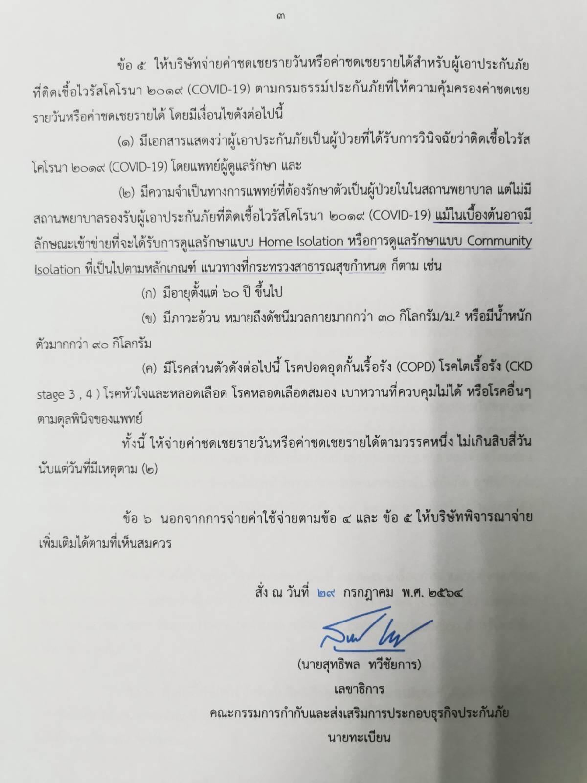 แต่ คปภ. ออกคำสั่งมาเพิ่มว่า ถ้าอยู่ HI หรือ CI แต่อาการป่วยเทียบเท่ากับต้อง admin โรงพยาบาล แต่ไม่ได้ admit เพราะเตียงโรงพยาบาลไม่ว่าง (จะเห็นว่าต้องย้ำว่าเตียงโรงพยาบาลไม่ว่างนะ ถ้าเตียงโรงพยาบาลว่างแล้วไม่ไปก็ไม่ได้ชดเชยเช่นกัน) อันนี้ก็ให้จ่ายชดเชยด้วยเหมือนกับนอนโรงพยาบาล